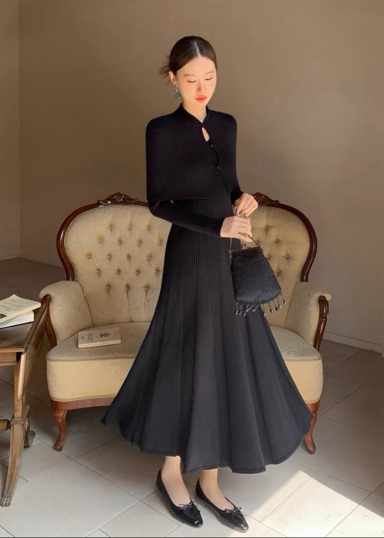 立ち襟とフロントのパール調ボタンが、よりエレガントな印象をプラスします。
