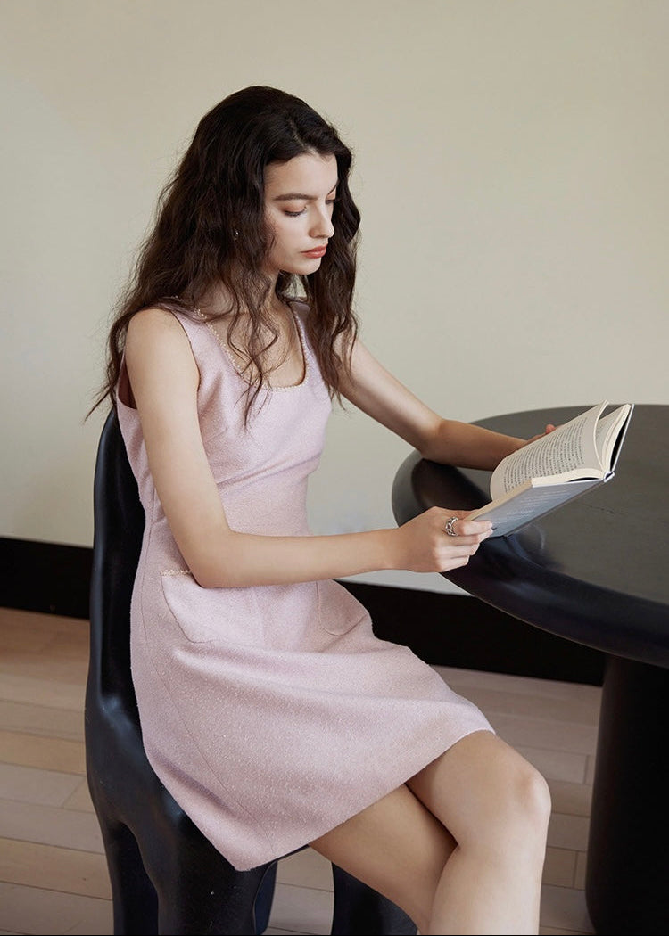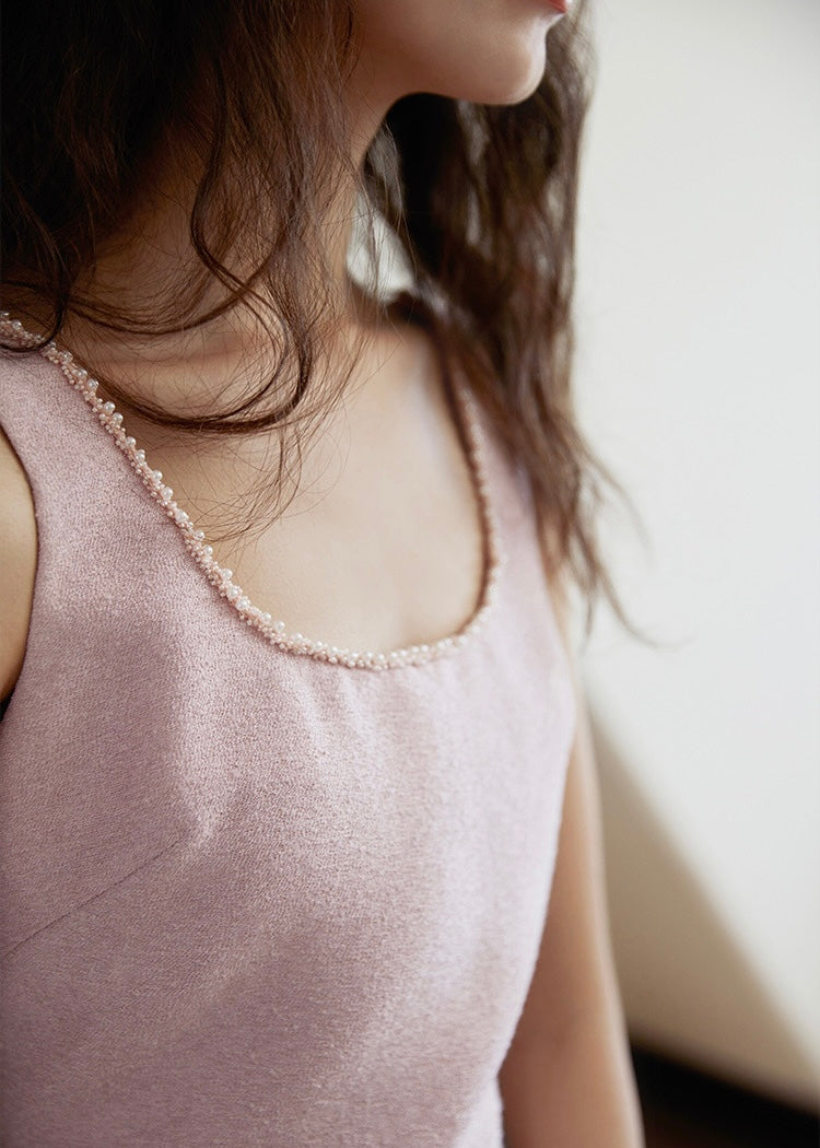 デコルテを美しく魅せるスクエアネックと、さりげないパールディテールが洗練されたエレガンスを演出します。程よくフィットするシルエットが女性らしいラインを引き立て、クラシックでありながら現代的なスタイルに仕上げました。