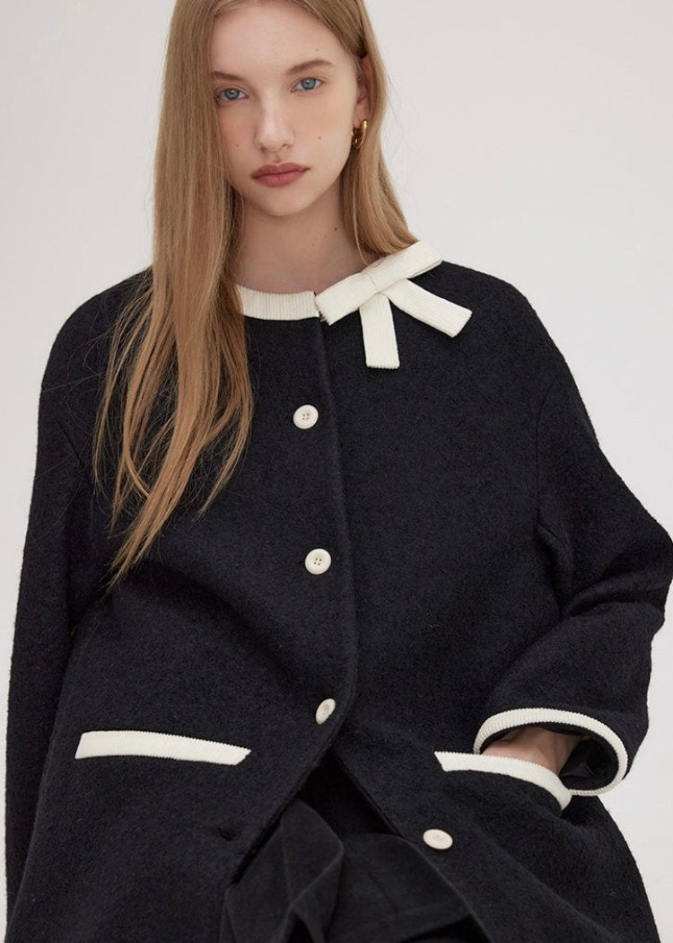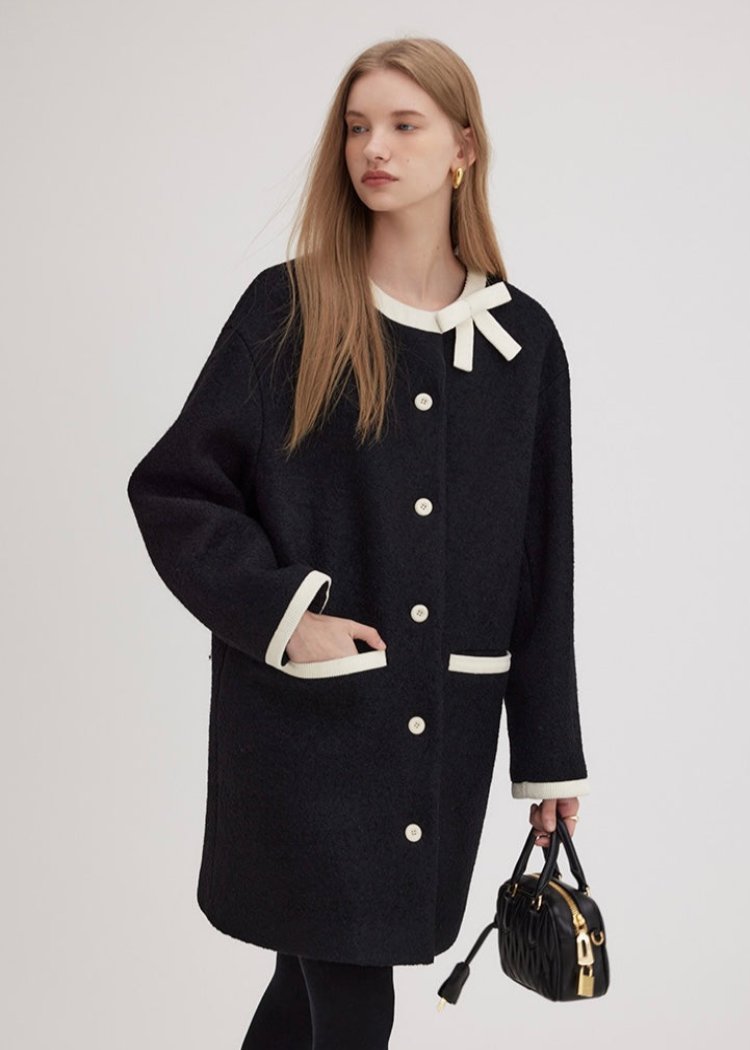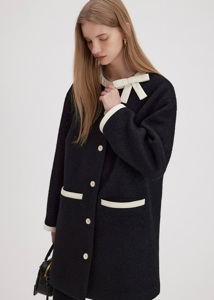 ブラックを基調に、ホワイトのディテールとリボンが上品なアクセントを加え、シンプルでありながらも視線を引きつけるデザインです。