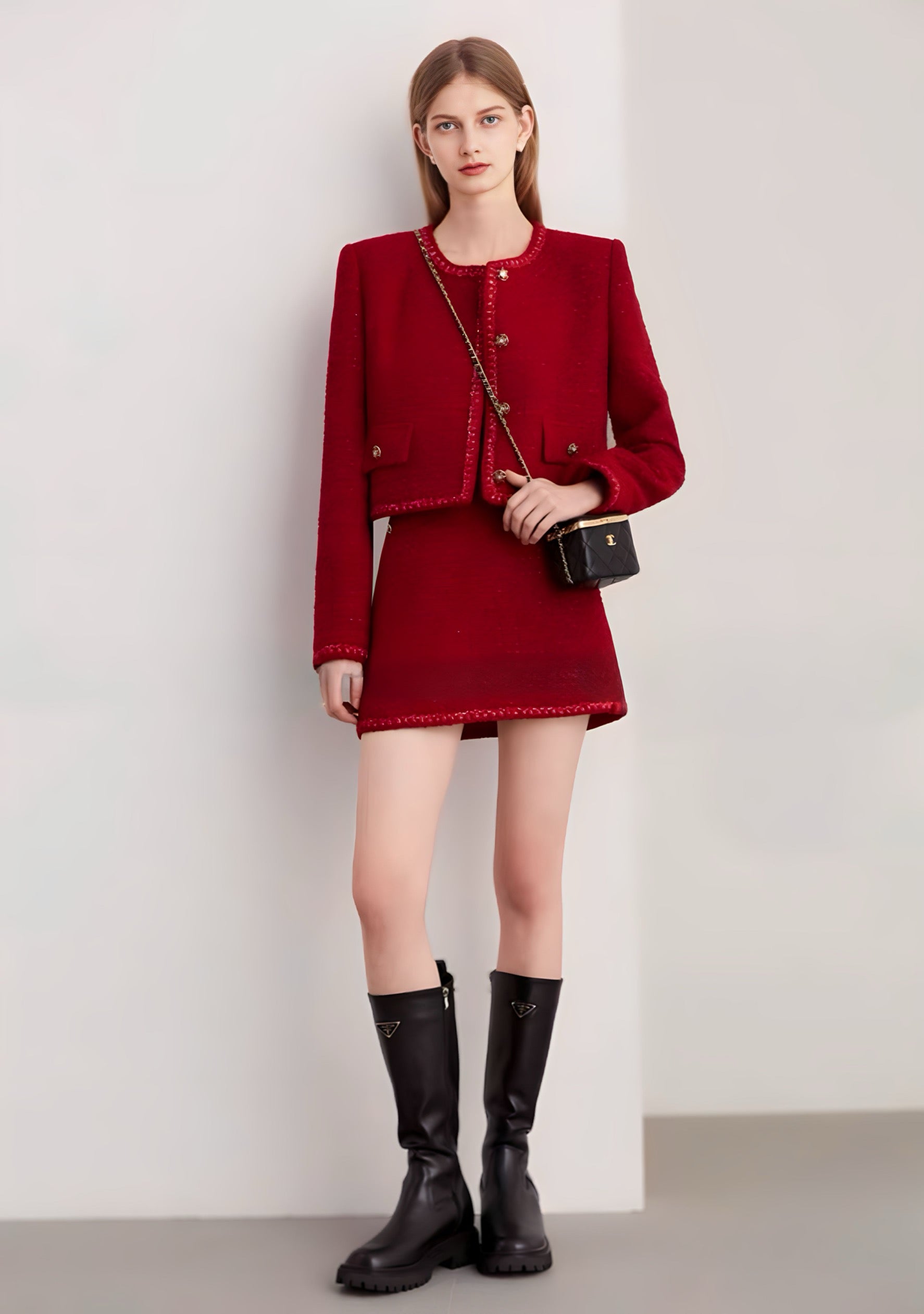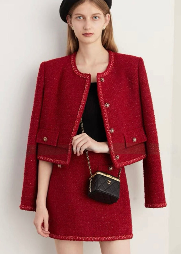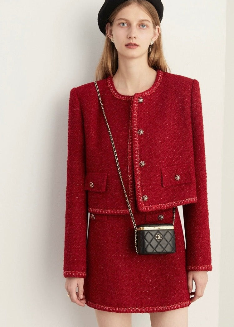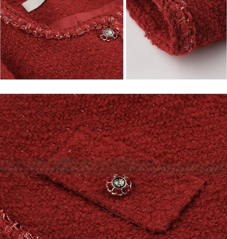 赤とゴールドの配色が可愛い拘りつまったデザインのツイードジャケットは一枚でコーディネートの主役に。