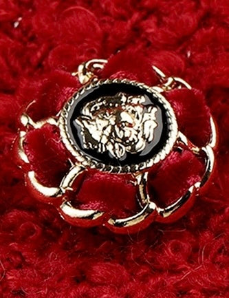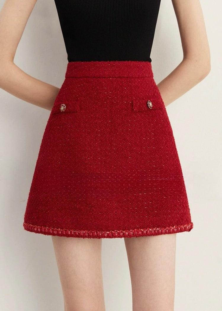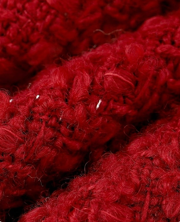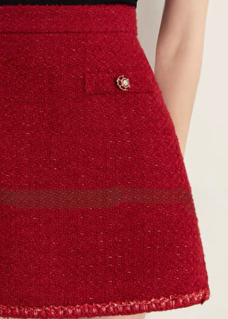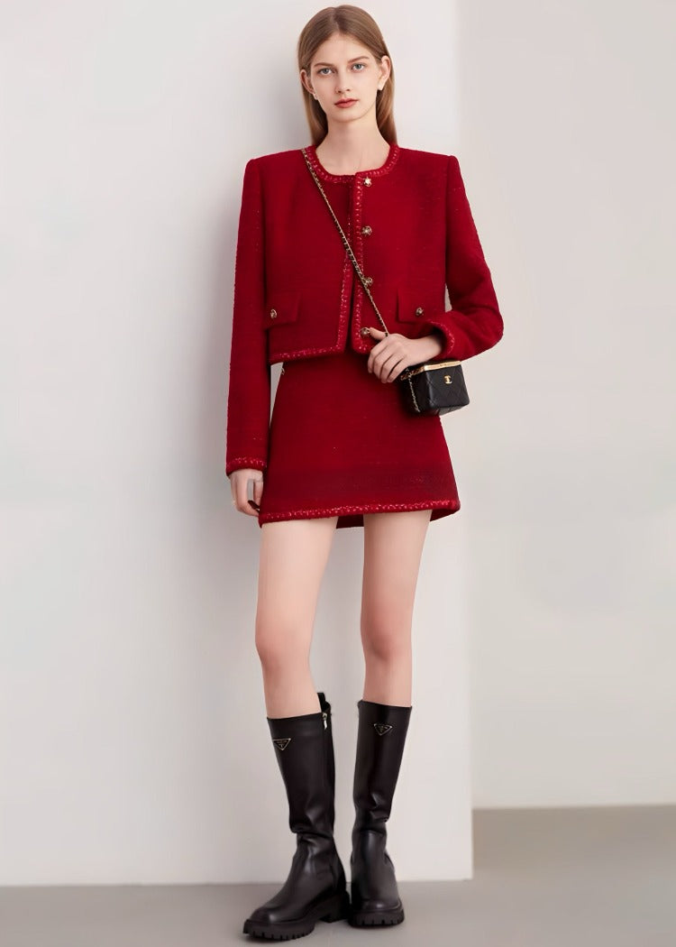 パッと目を引くレッドカラーが他にはないラグジュアリーな印象のツイードセットアップ。