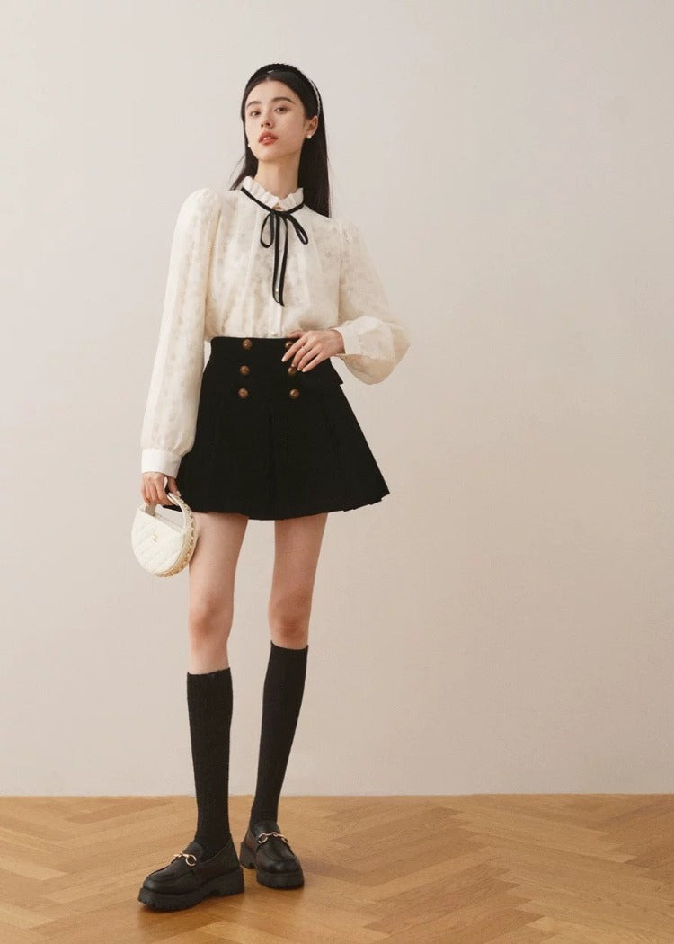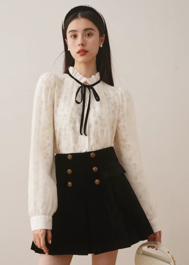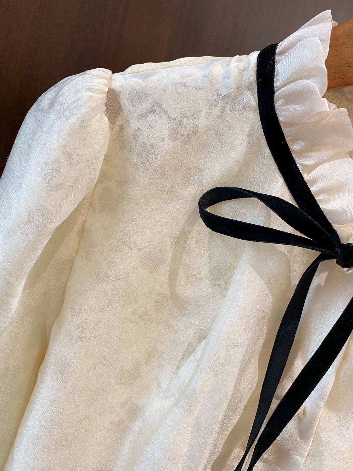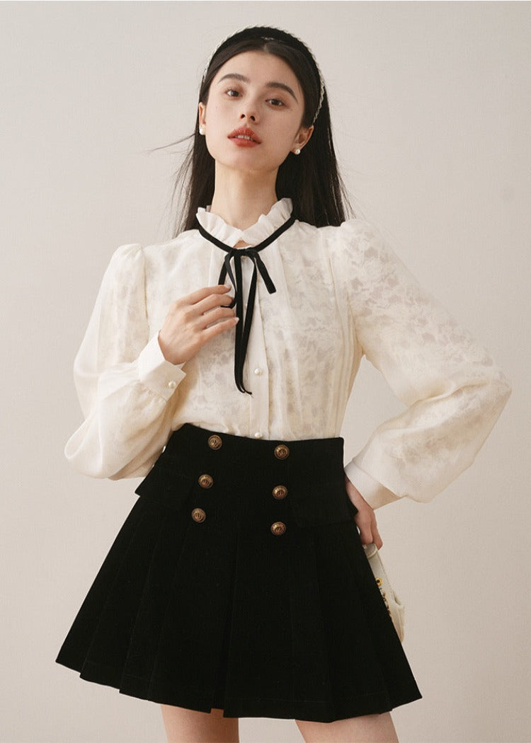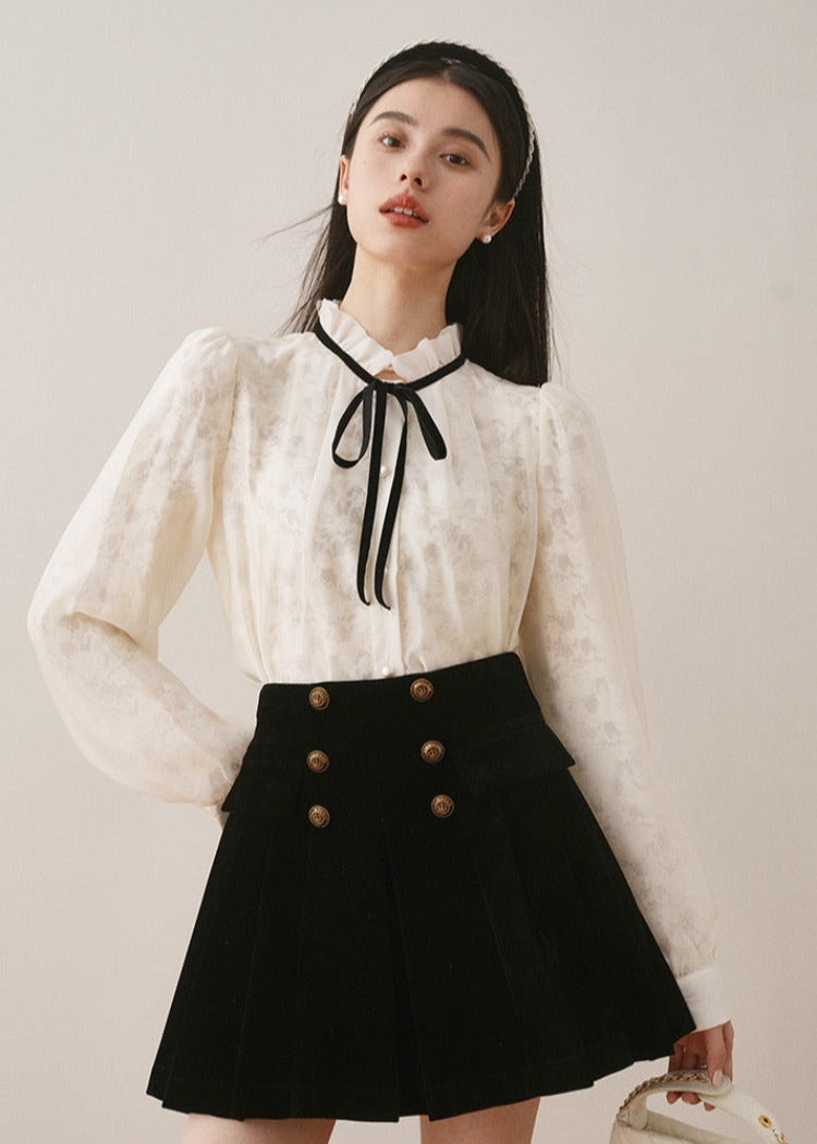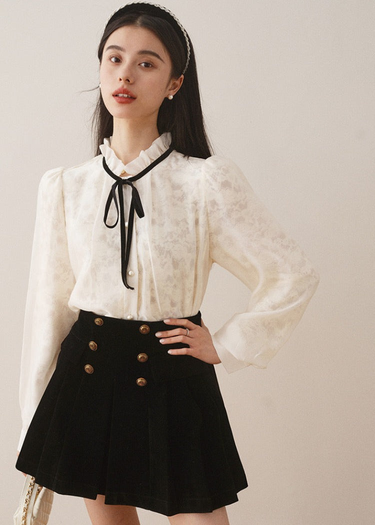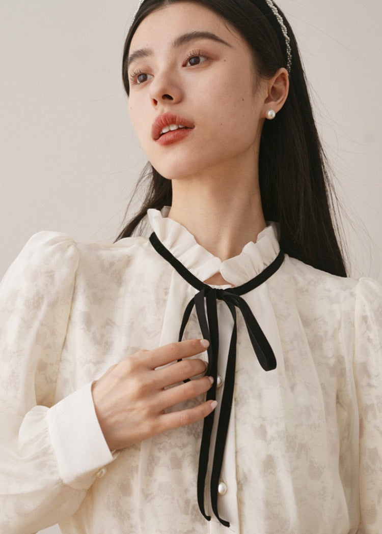 裏地にレースを施し、シフォン素材のブラウスから透けるようなデザインとなっております。お首元にはボウタイを、ボタンはパールでガーリーな要素をたくさん取り入れ可愛いが詰まったブラウスとなりました。