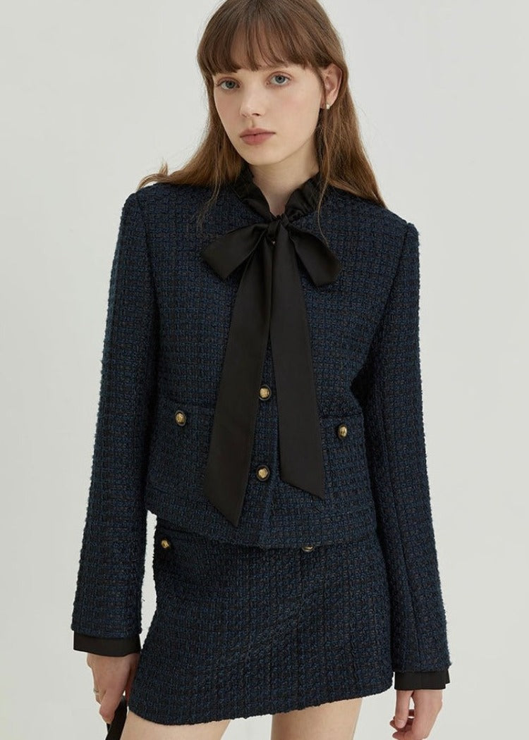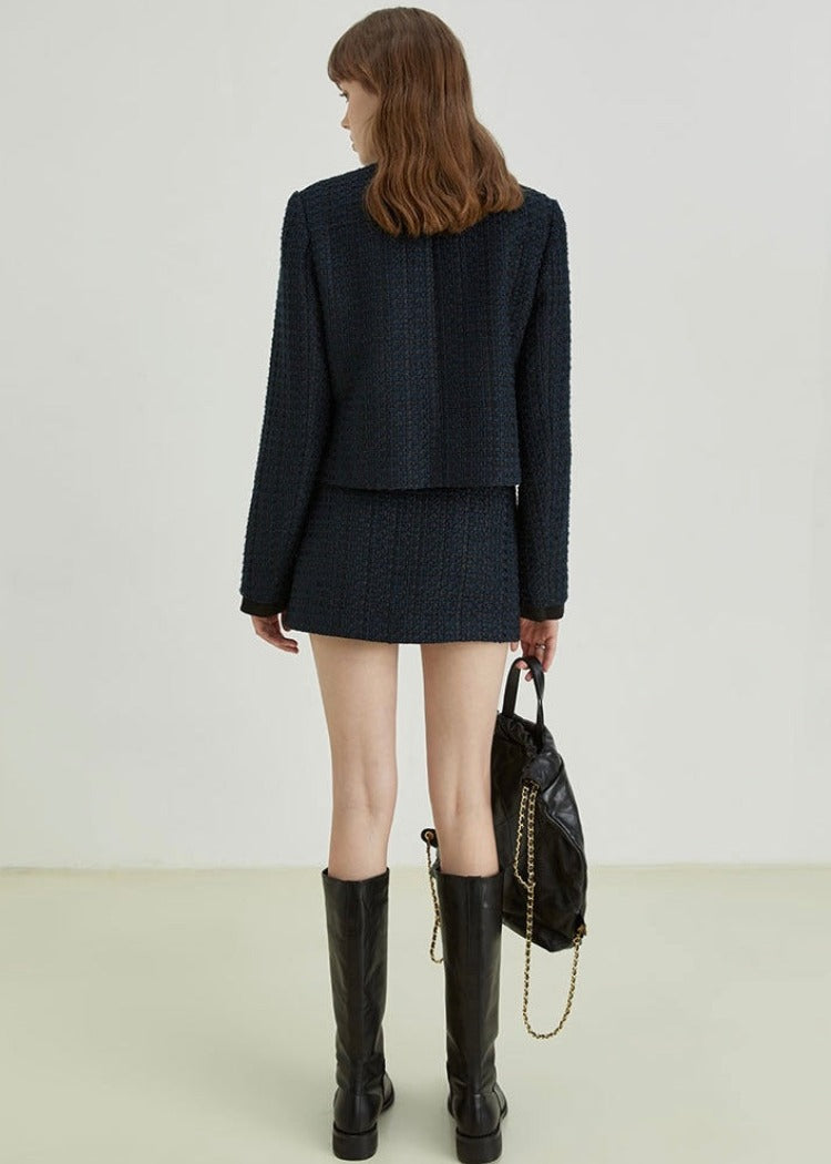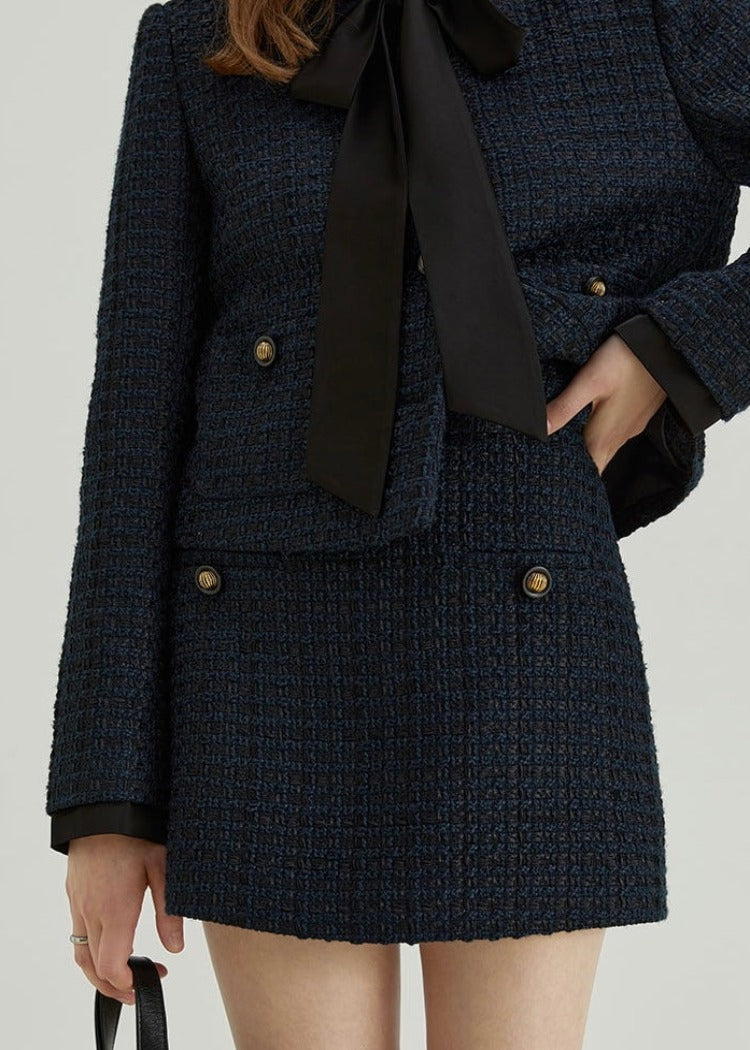We recommend pairing this simple yet gold-buttoned skirt with a matching tweed jacket.