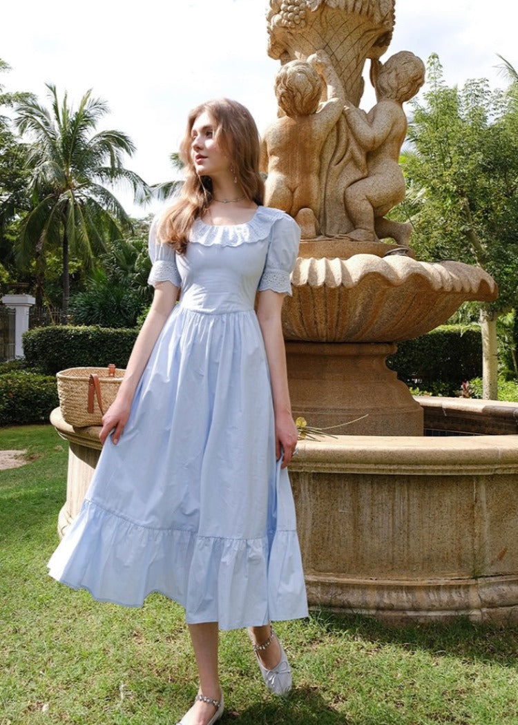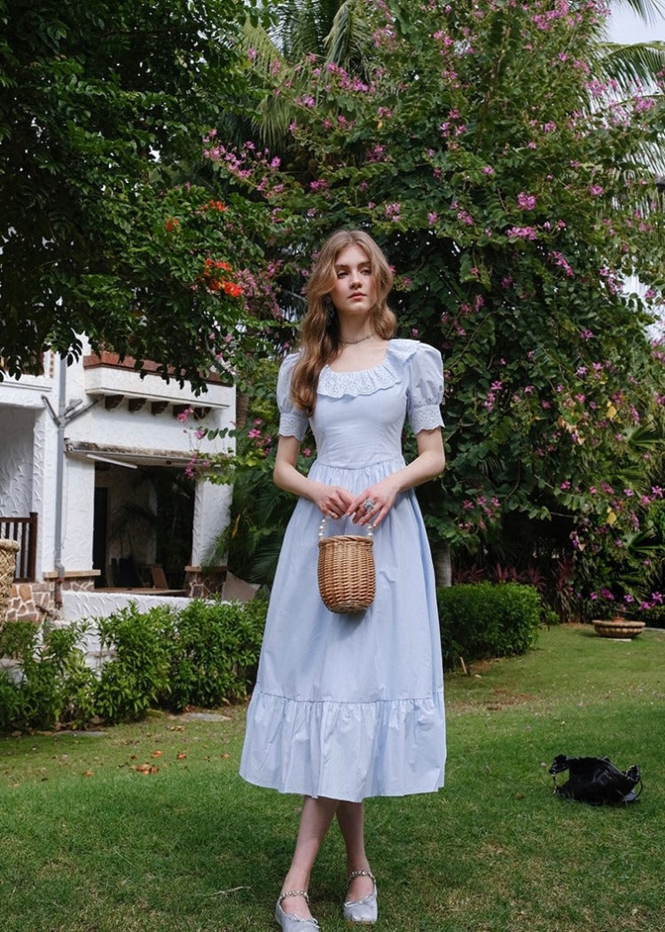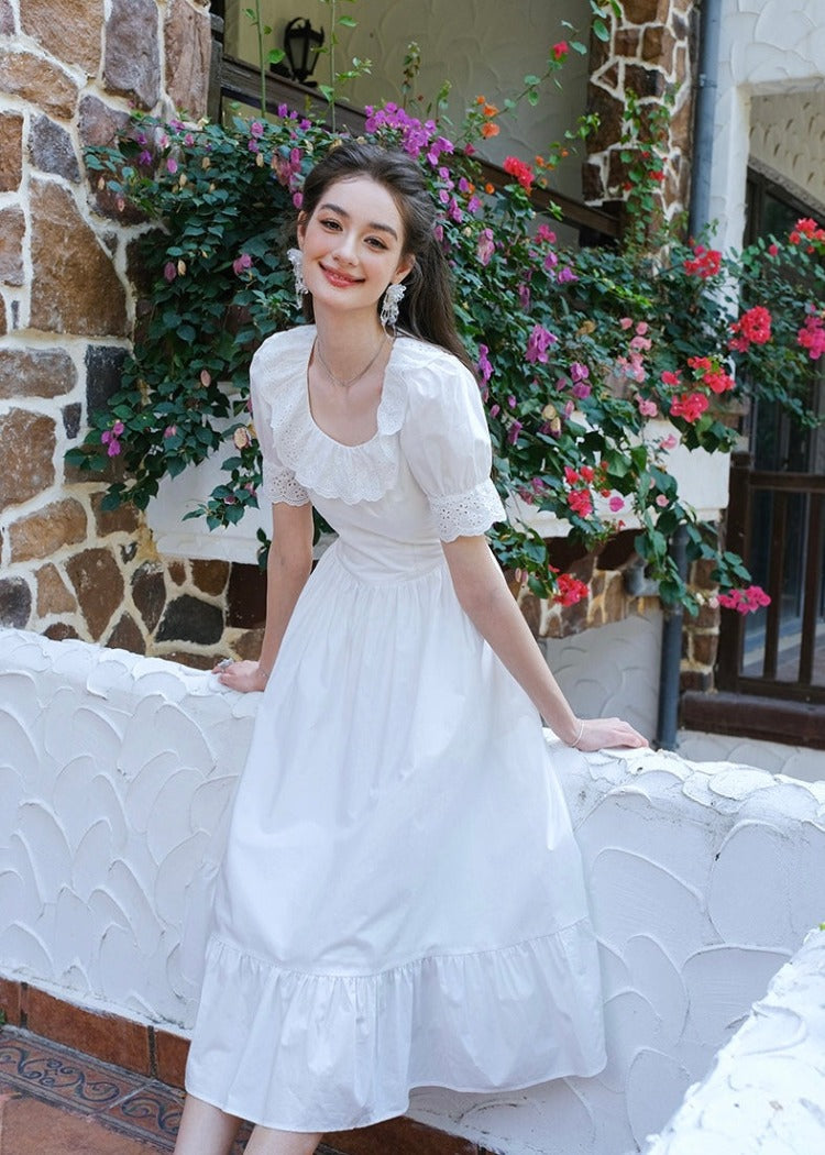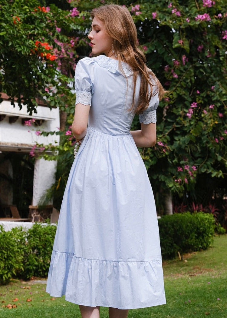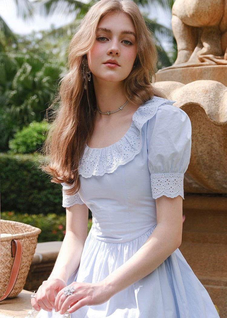 所々にフェミニン要素を取り入れ、どこから見ても抜かりない可愛さを演出する大きめな襟デザインがポイントのドレス。