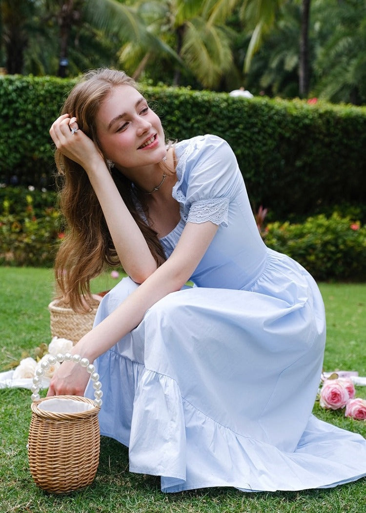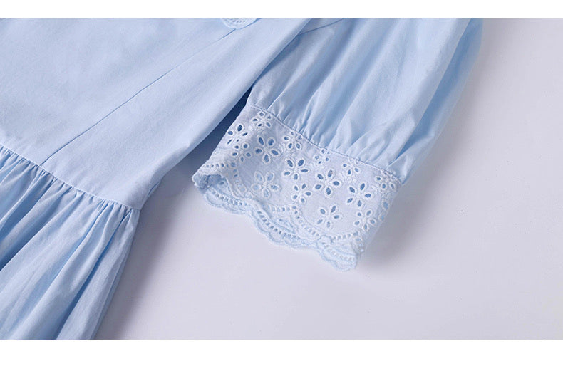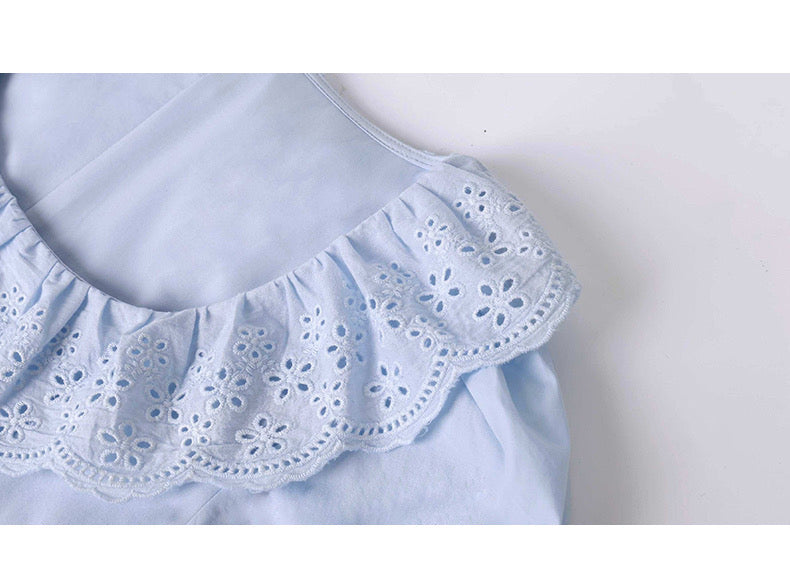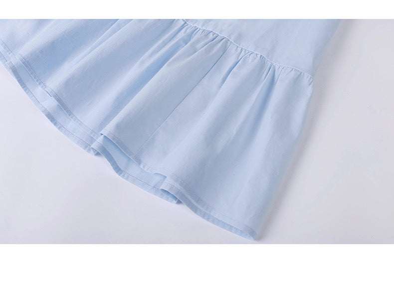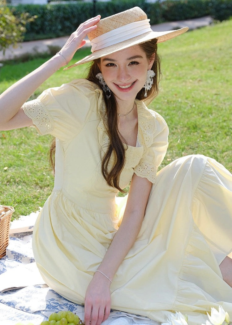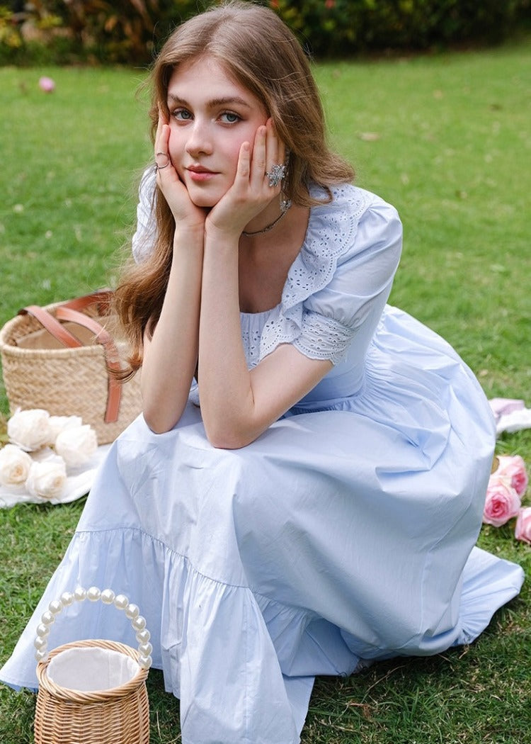 所々にフェミニン要素を取り入れ、どこから見ても抜かりない可愛さを演出する大きめな襟デザインがポイントのドレス。
