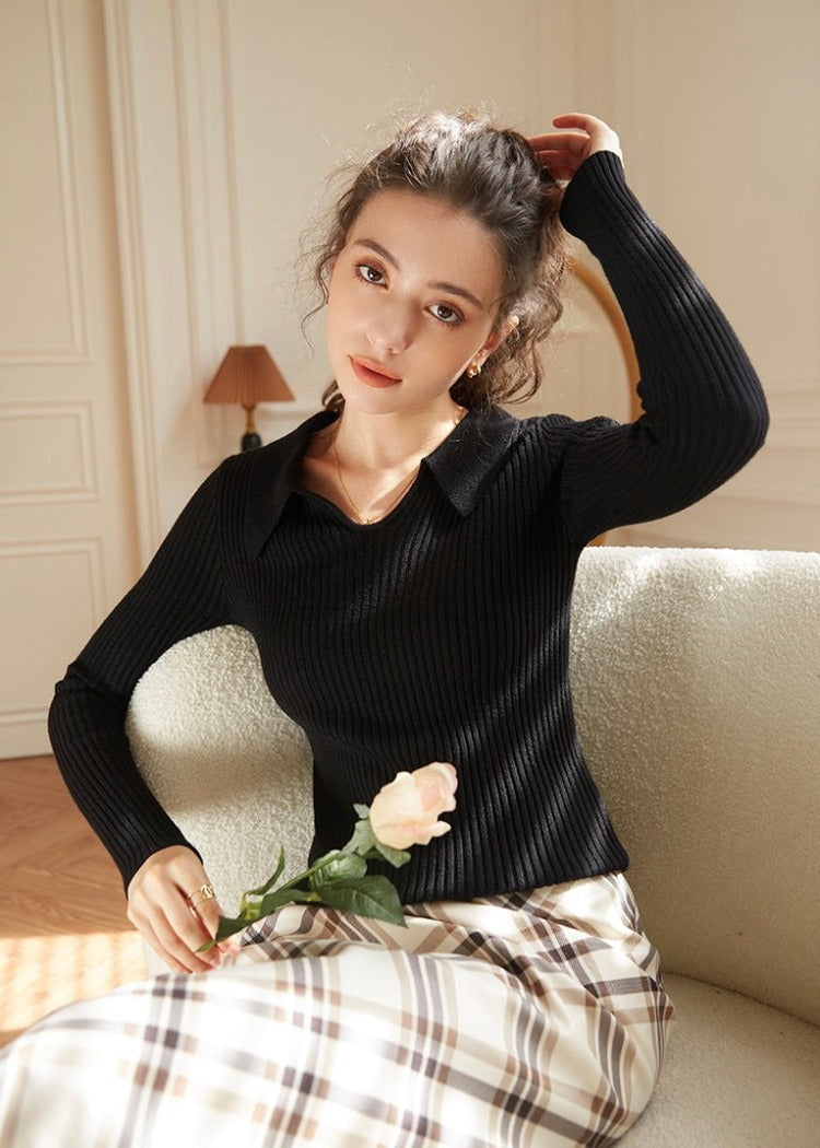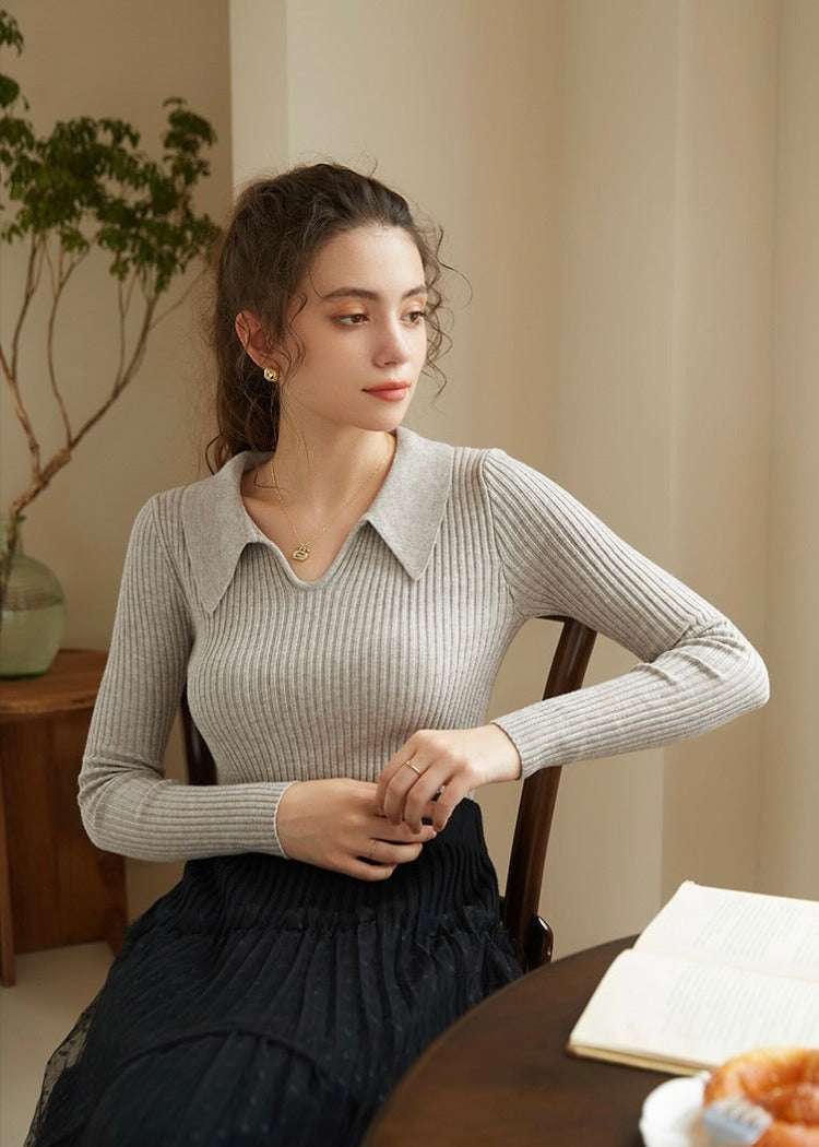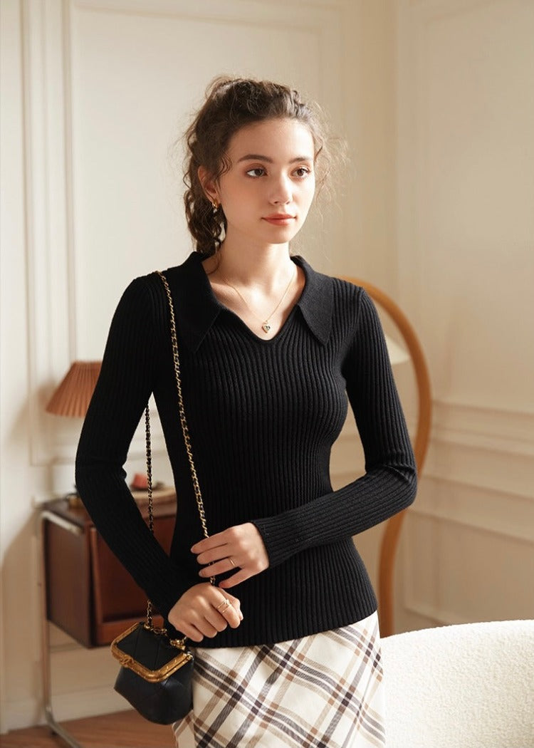 It has a moderately open neck and a perfect fit to the body for a feminine impression.
