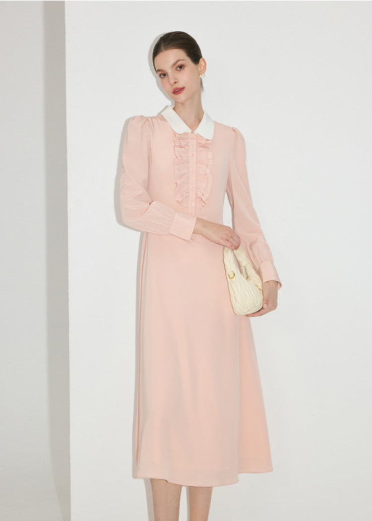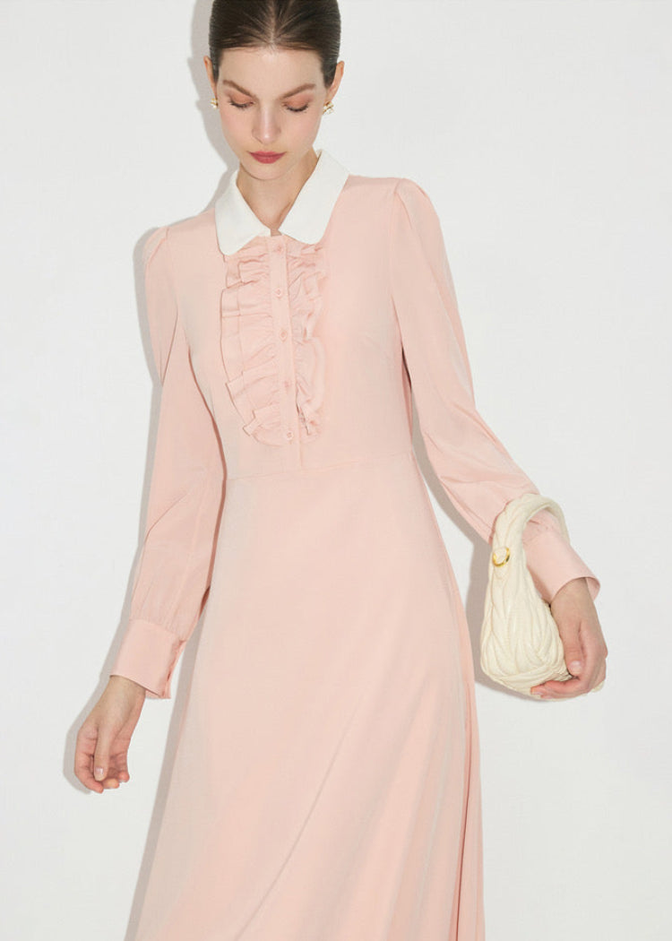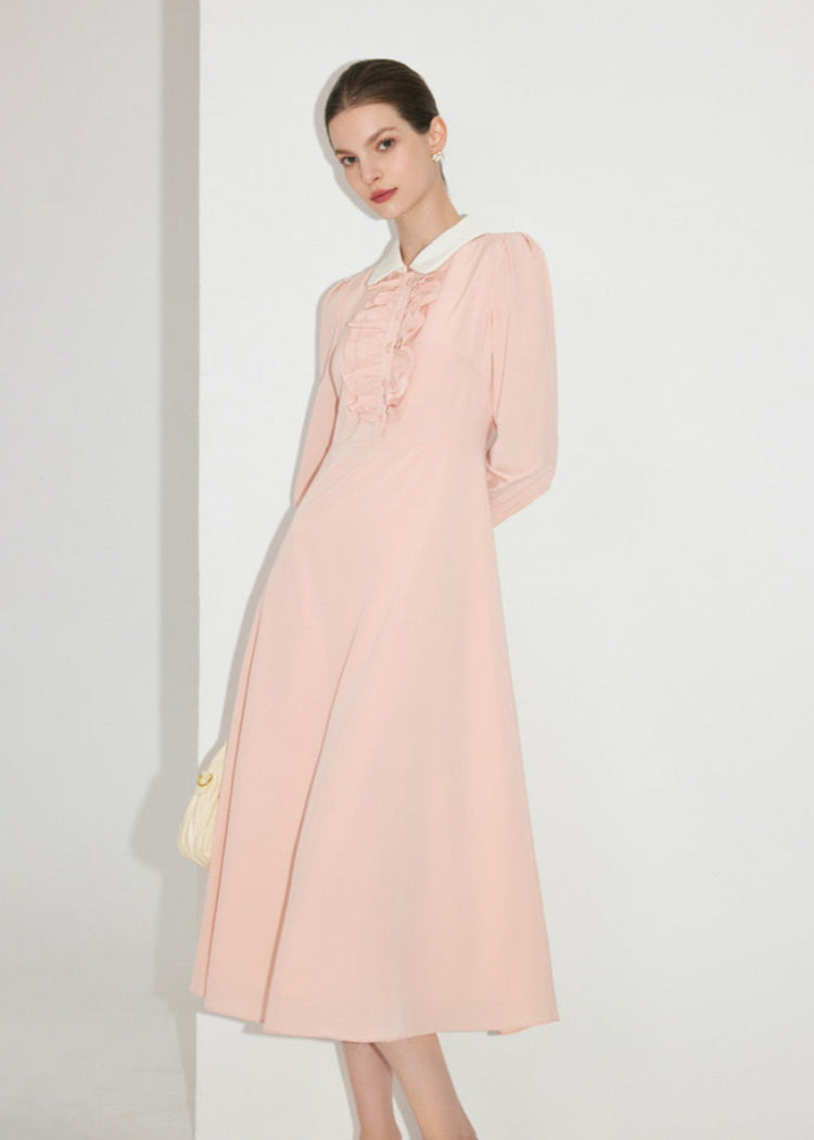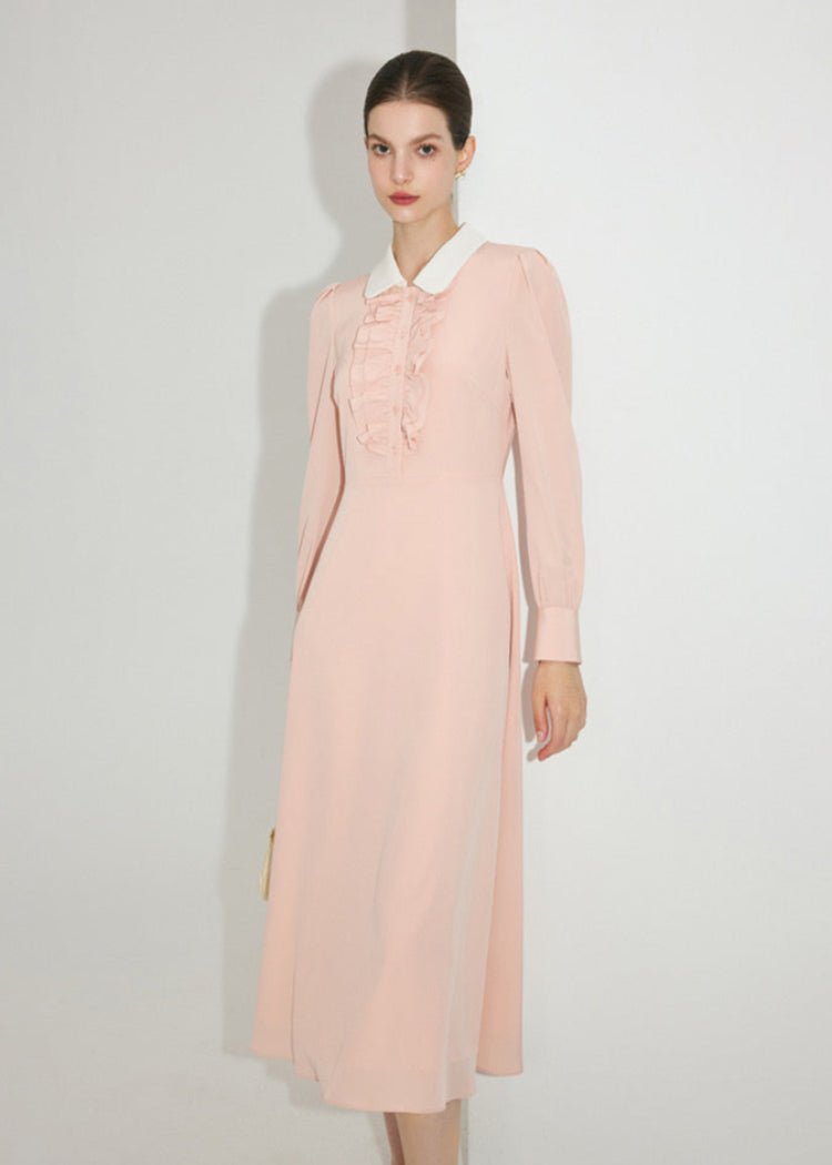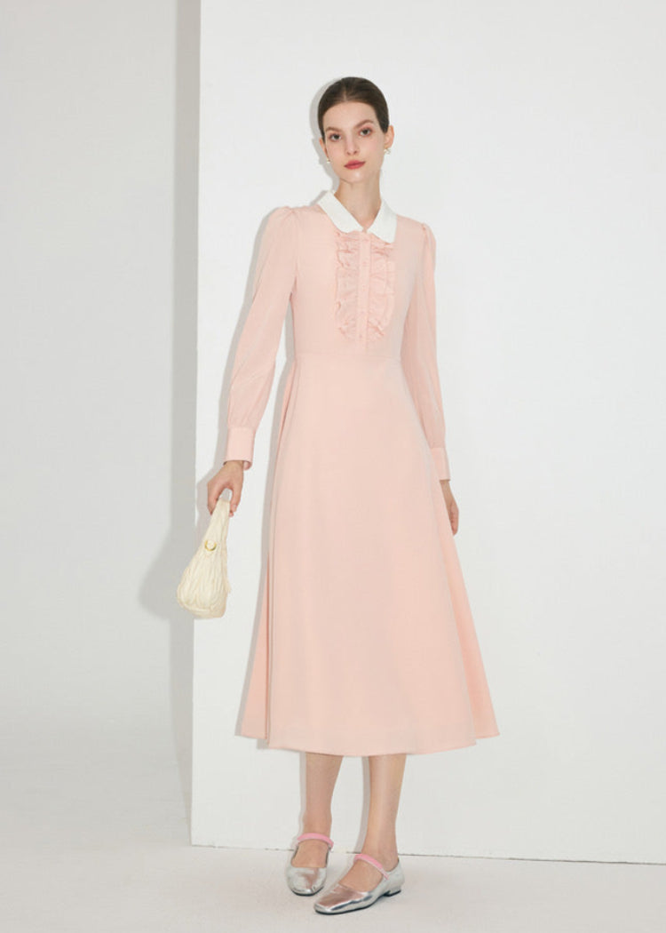 コントラストカラーの襟と繊細なフリルが上品さを演出し、