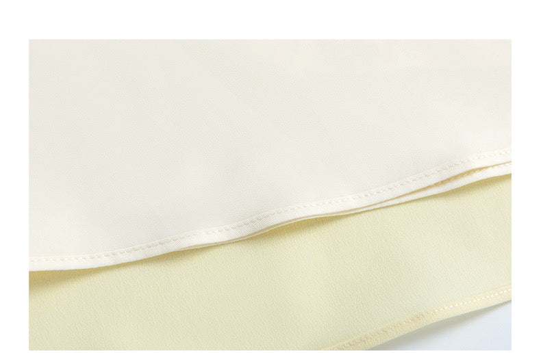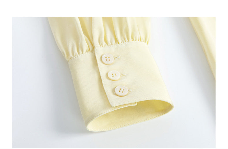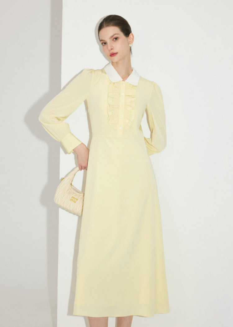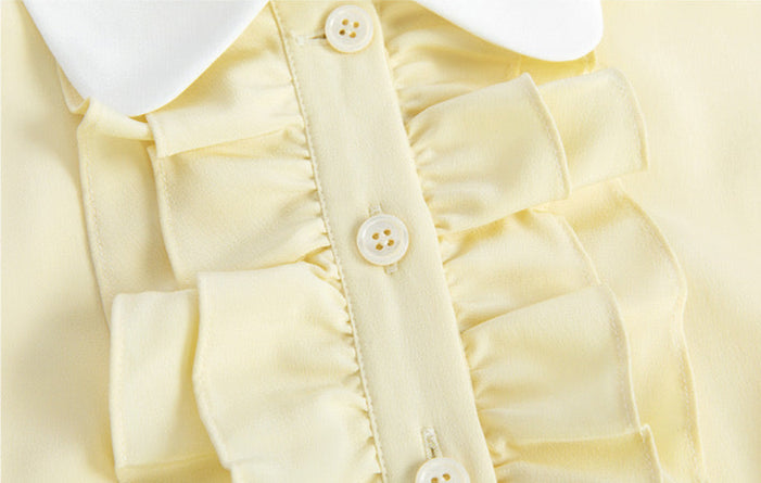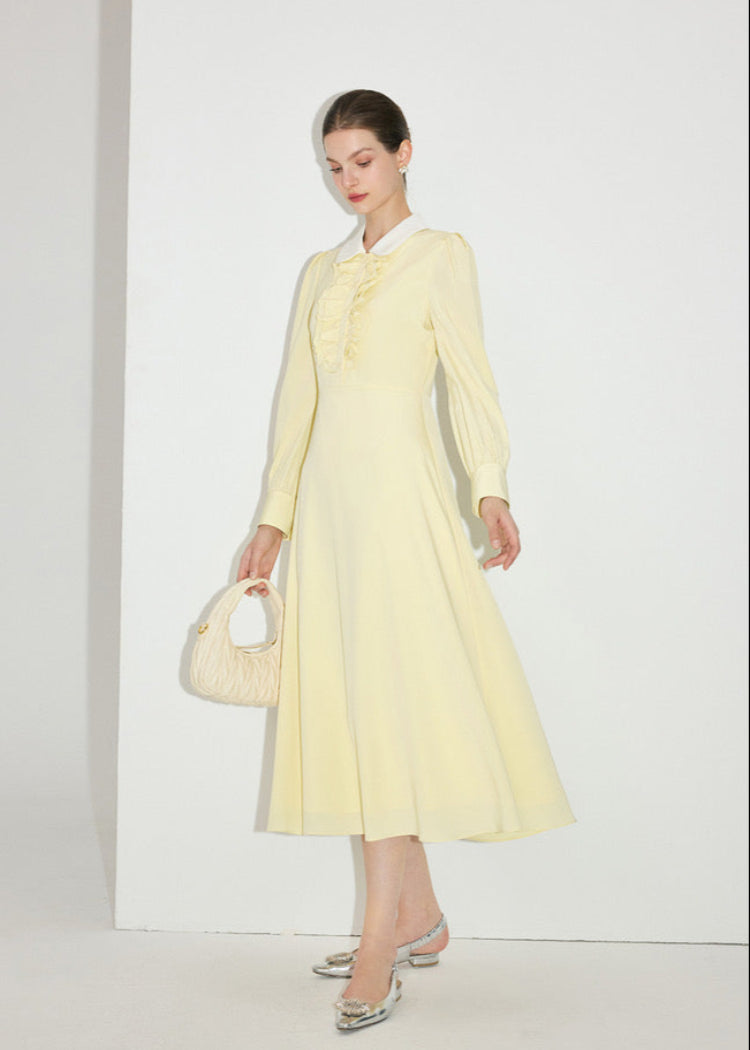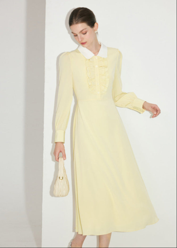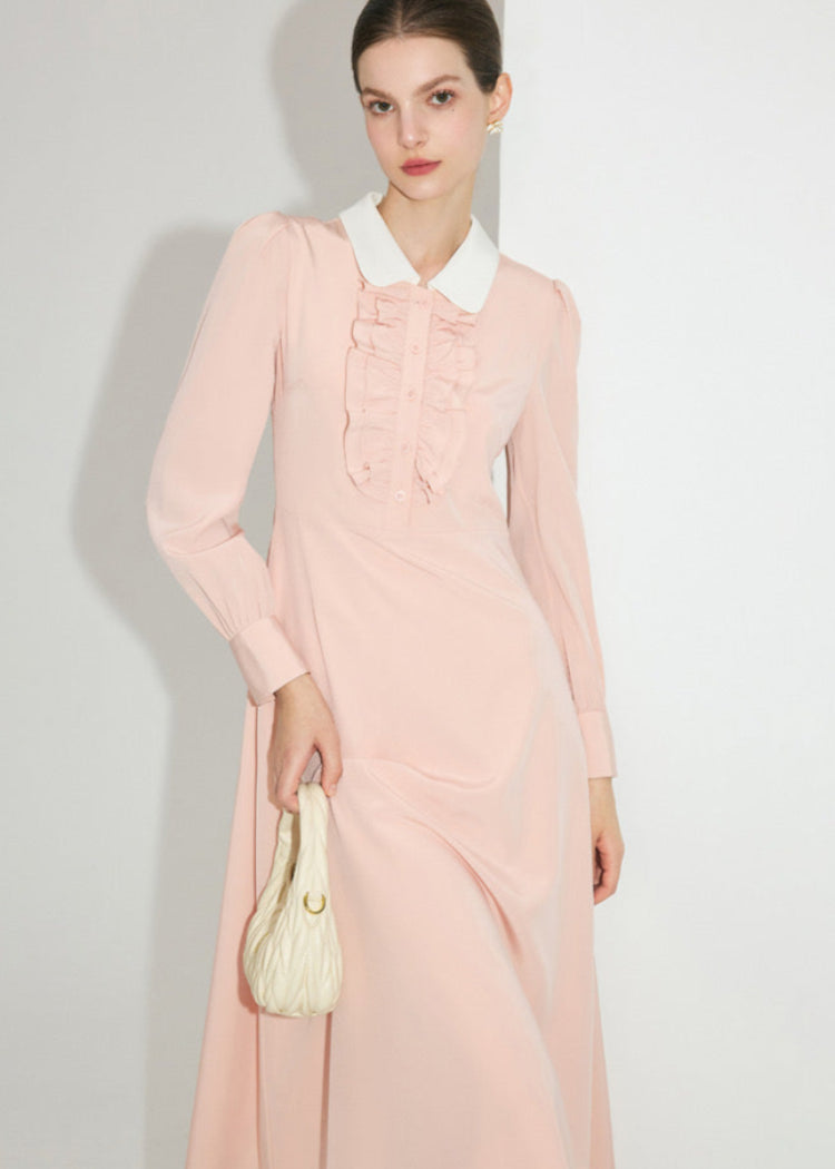 コントラストカラーの襟と繊細なフリルが上品さを演出し、