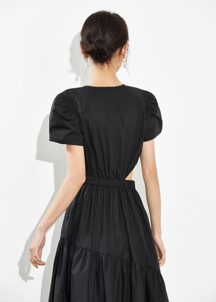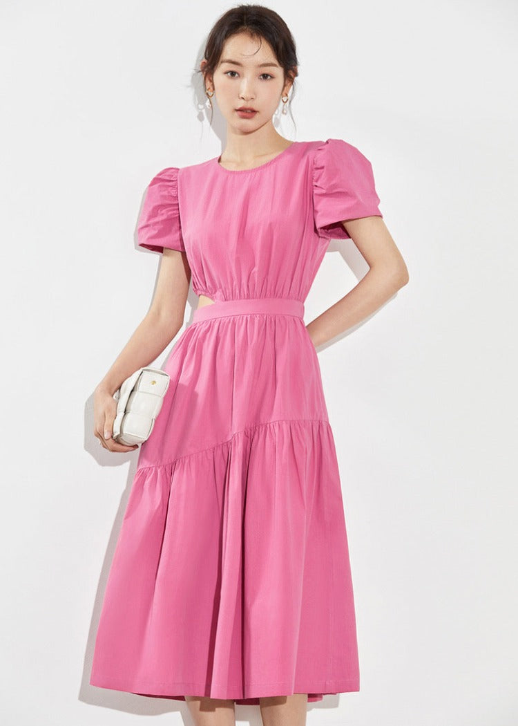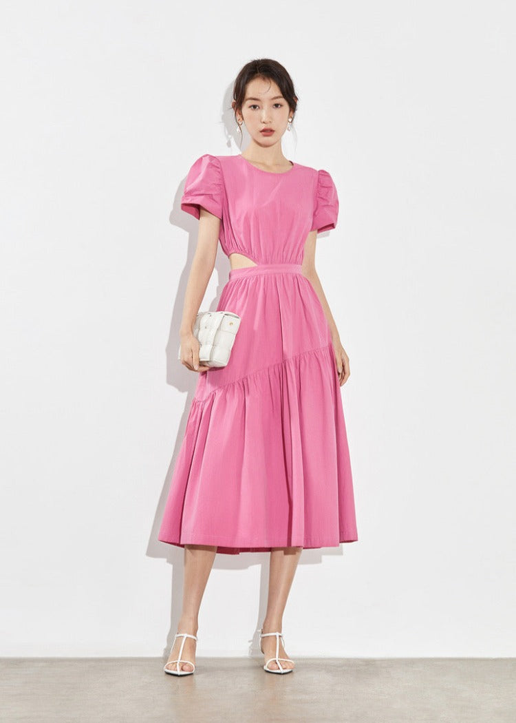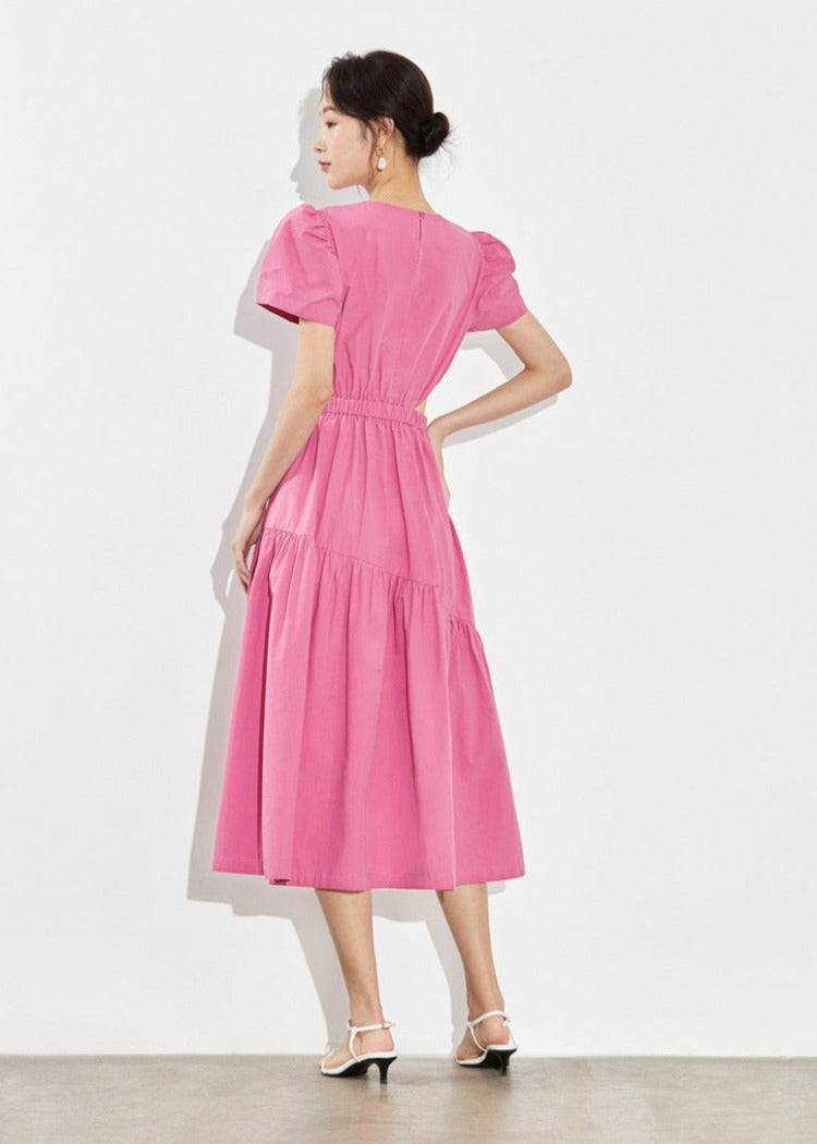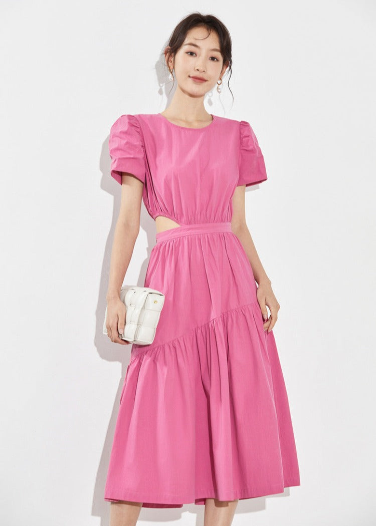 片側にのみいれたウエストのカッティングと斜めに入れたタックでアシンメトリーデザインに仕上がったワンピースは他と差がつく一枚。