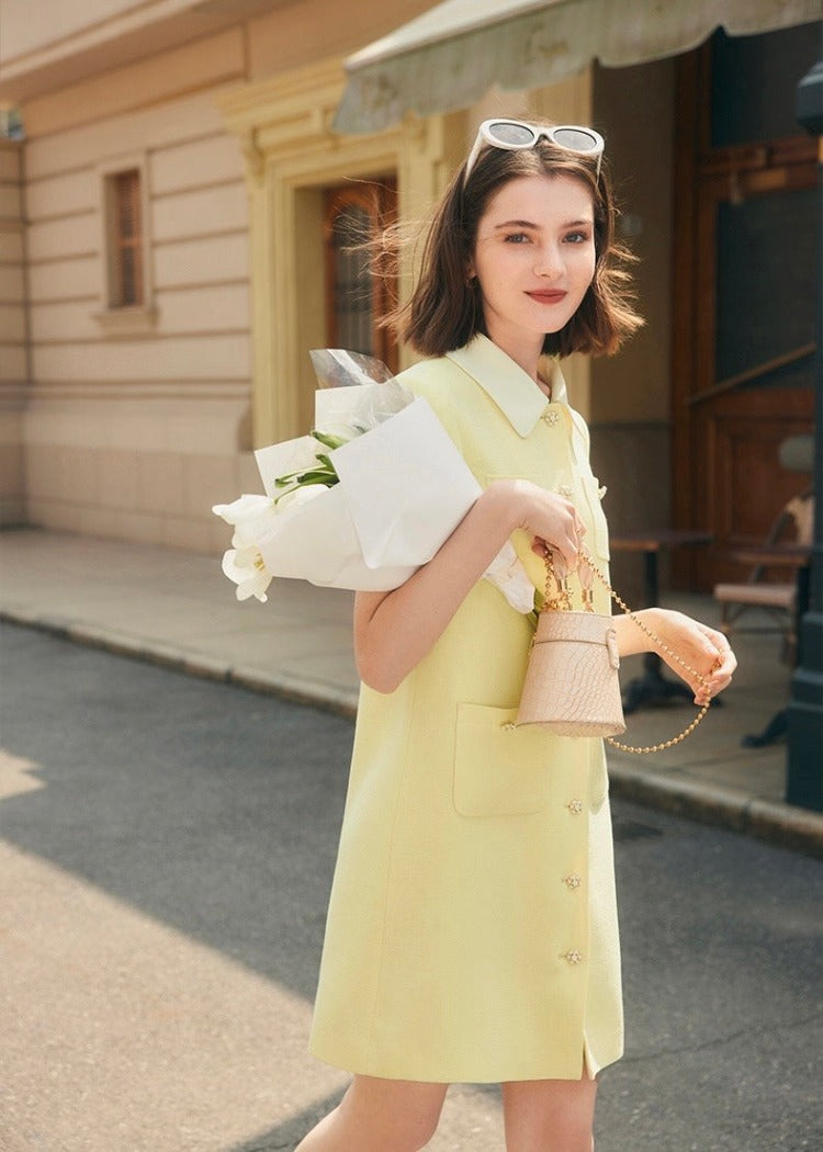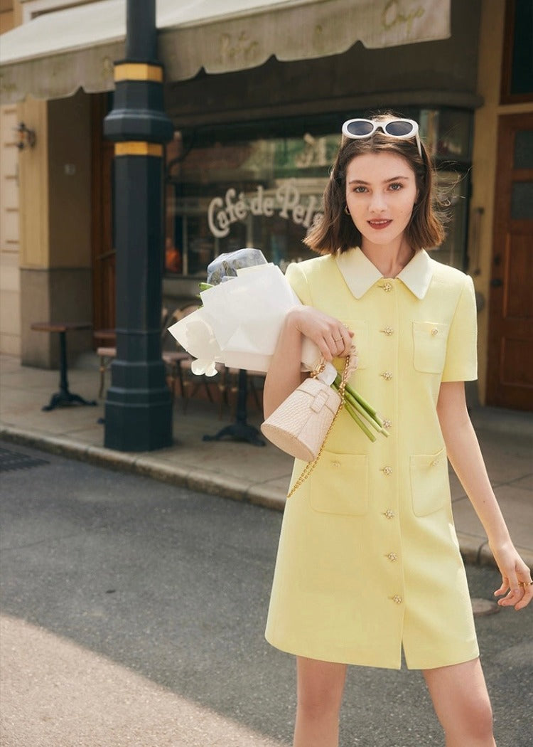 前立てのボタン部分にはジュエリーのようなビジューを施し、アクセサリーがなくても1枚纏うだけでコーディネートが完成します。