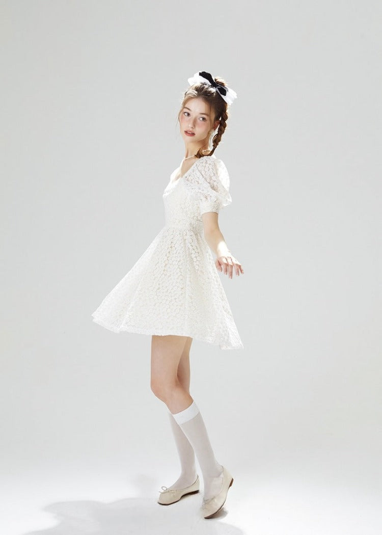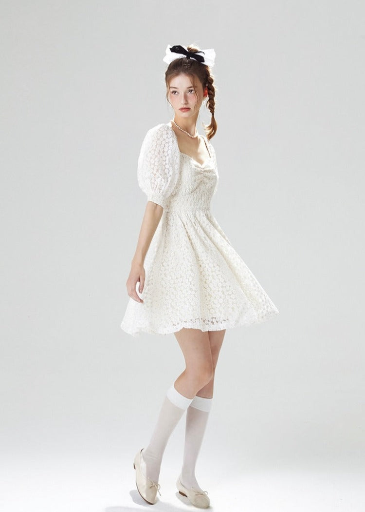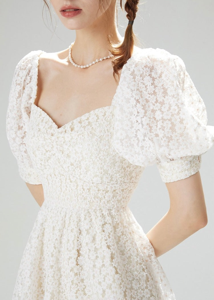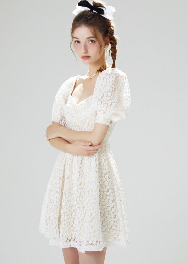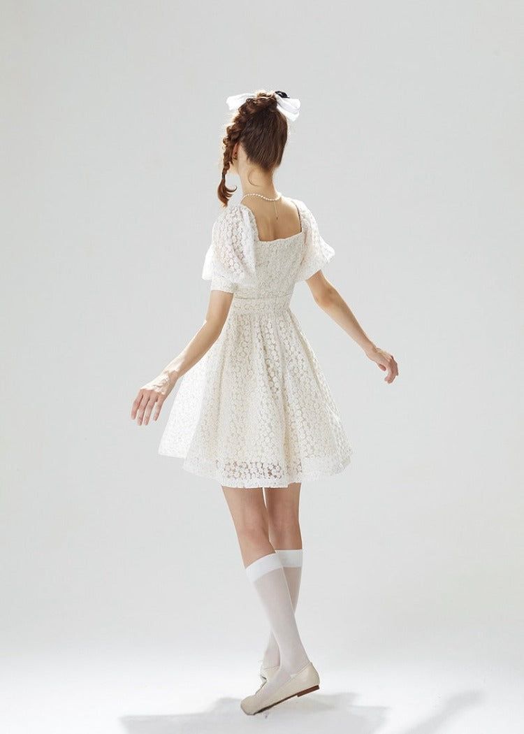 ふんわりとしたパフスリーブの袖もポイント。ウエストから下のスカート部分はギャザーデザインを施しふんわりと広がるシルエットに仕上げました。スクエアネックラインで抜け感を出し、抜かりのない可愛さをプラスします。