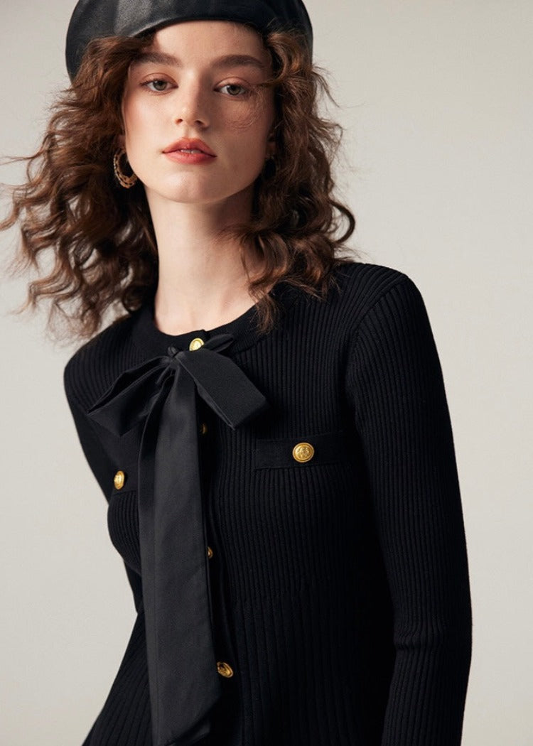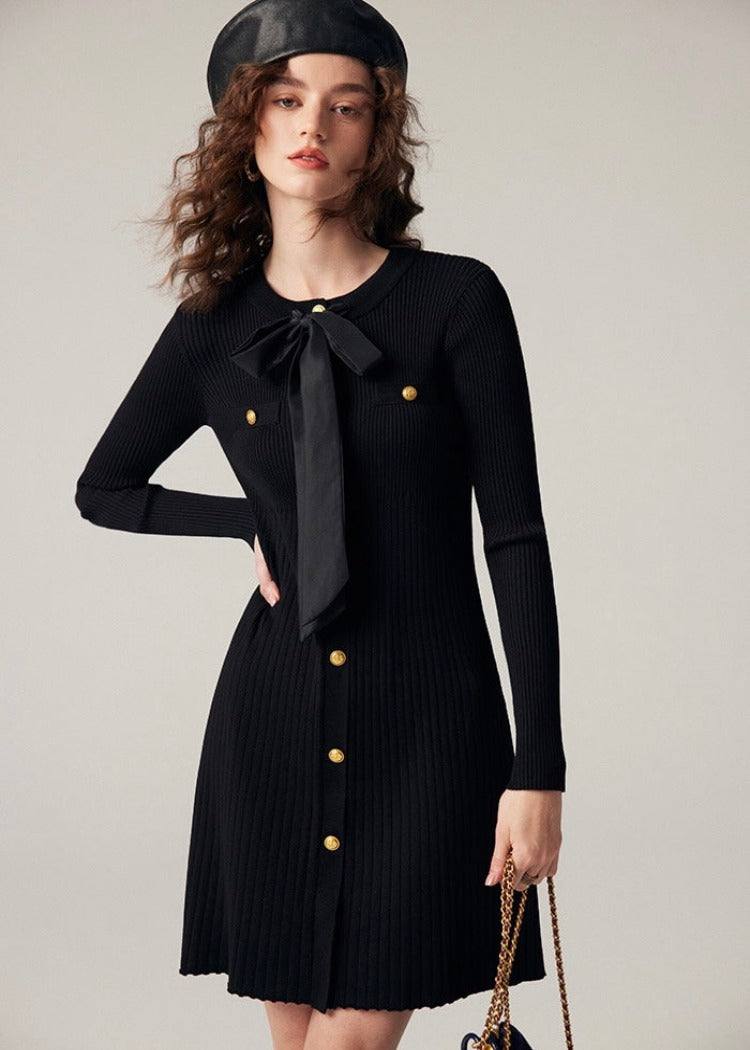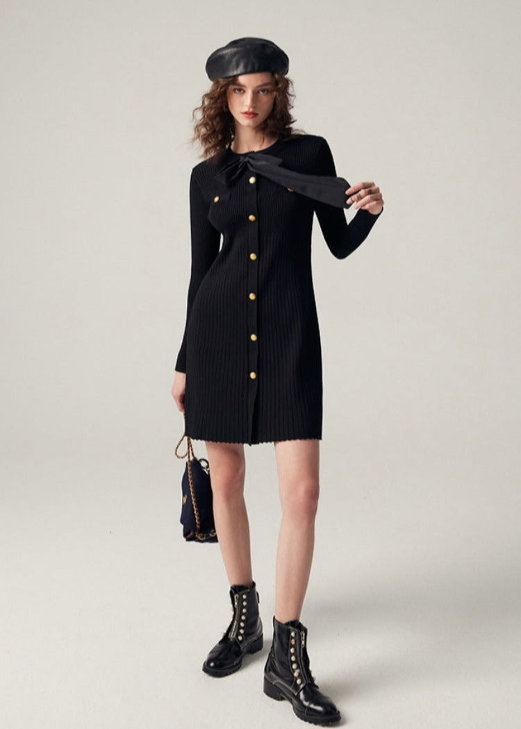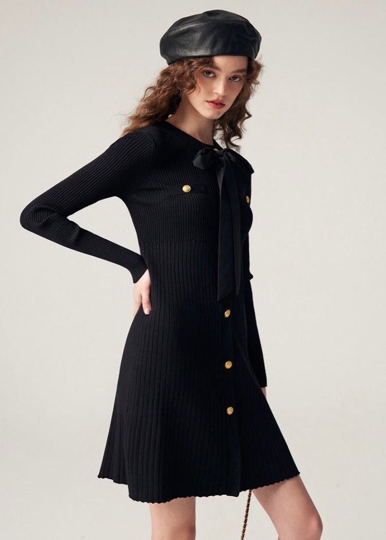 サテンリボンとゴールドボタンがフレンチクラシカルな印象のリブニット黒ワンピ。