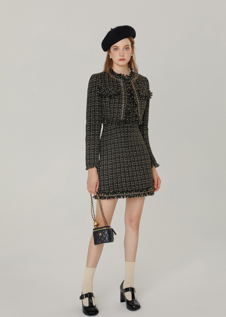 ブラックとアンティーク調のゴールドのコントラストでクラス感溢れる上品なツイードワンピース。シンプルでありながらディティールにこだわり、拘りを込めたとっておきの一枚です。