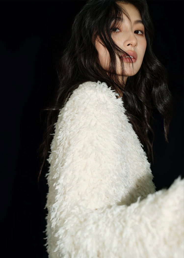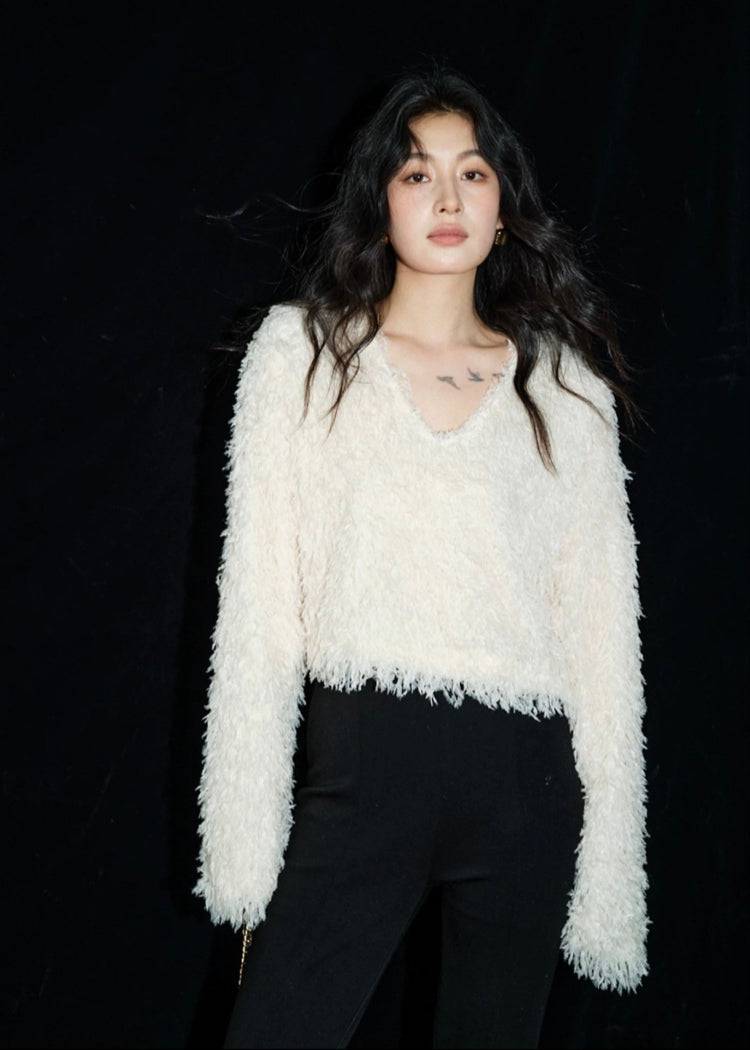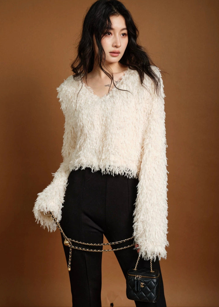 やわらかなフェザーボア素材を贅沢に使用した、軽やかで女性らしいVネックトップス。ふんわりとしたボリューム感のある毛足が肌を優しく包み込み、華やかさと抜け感を兼ね備えた一枚です。