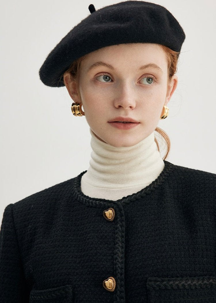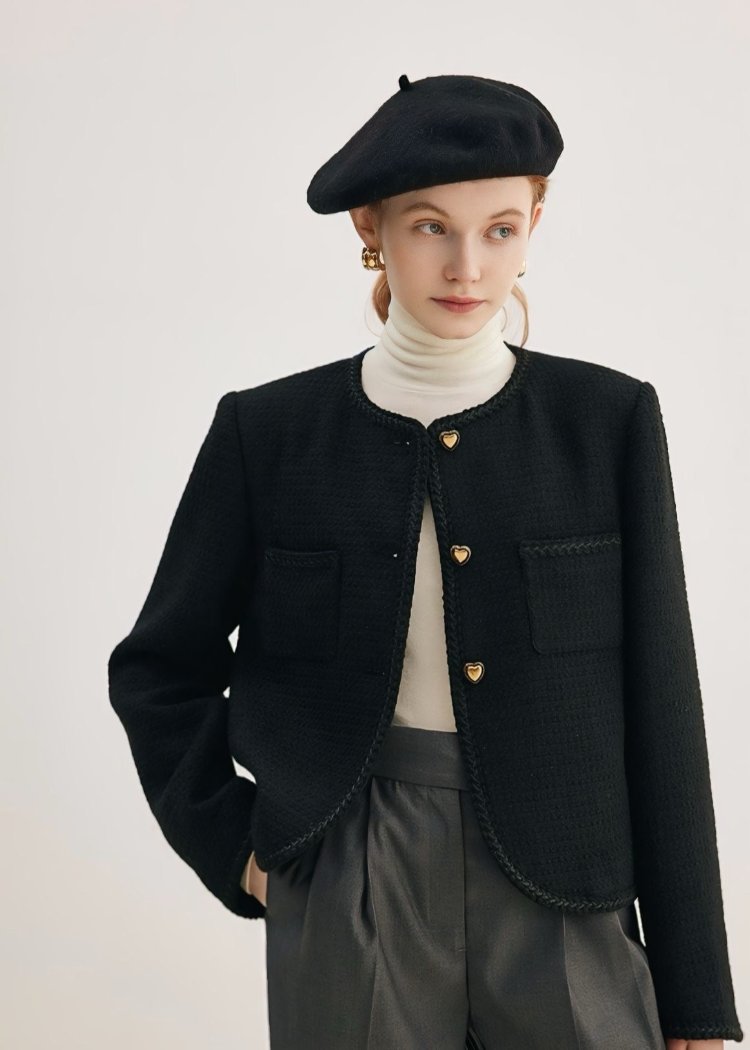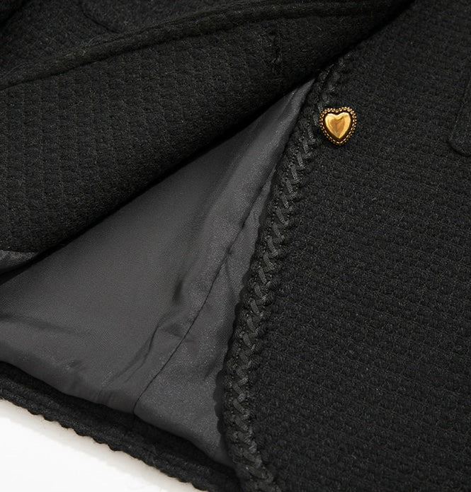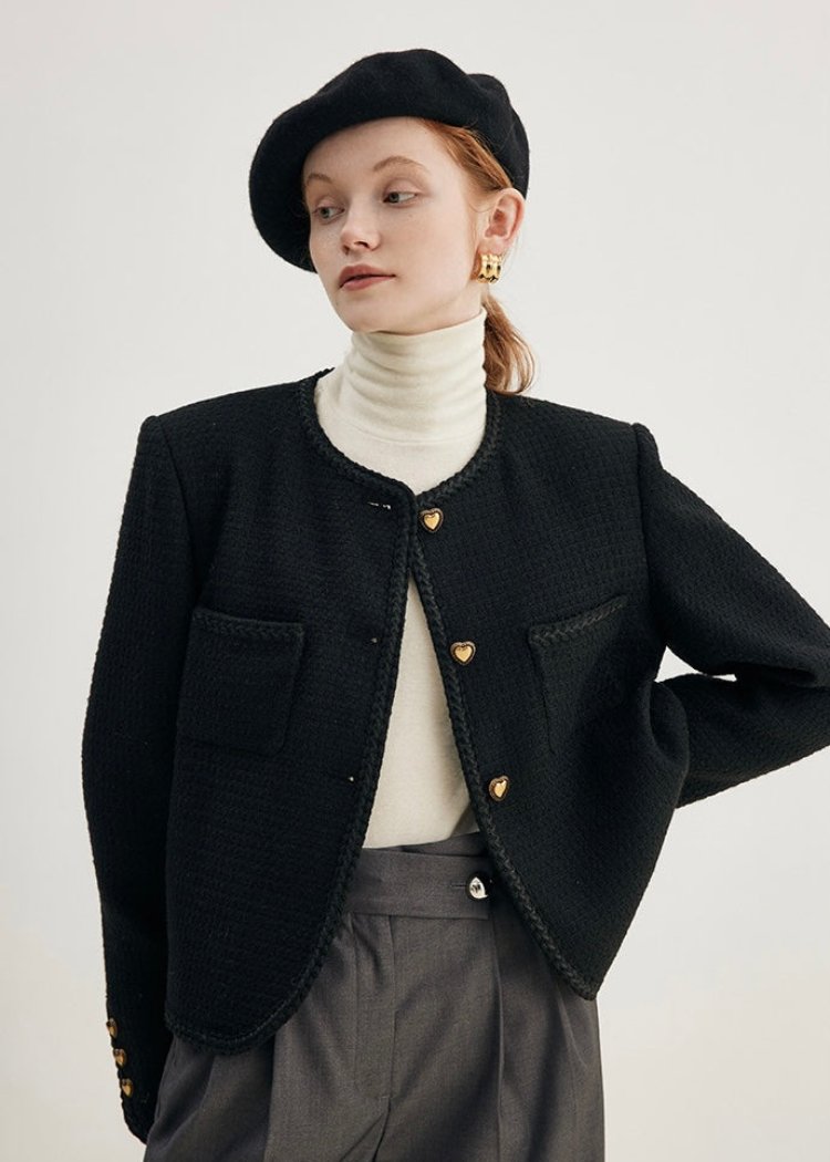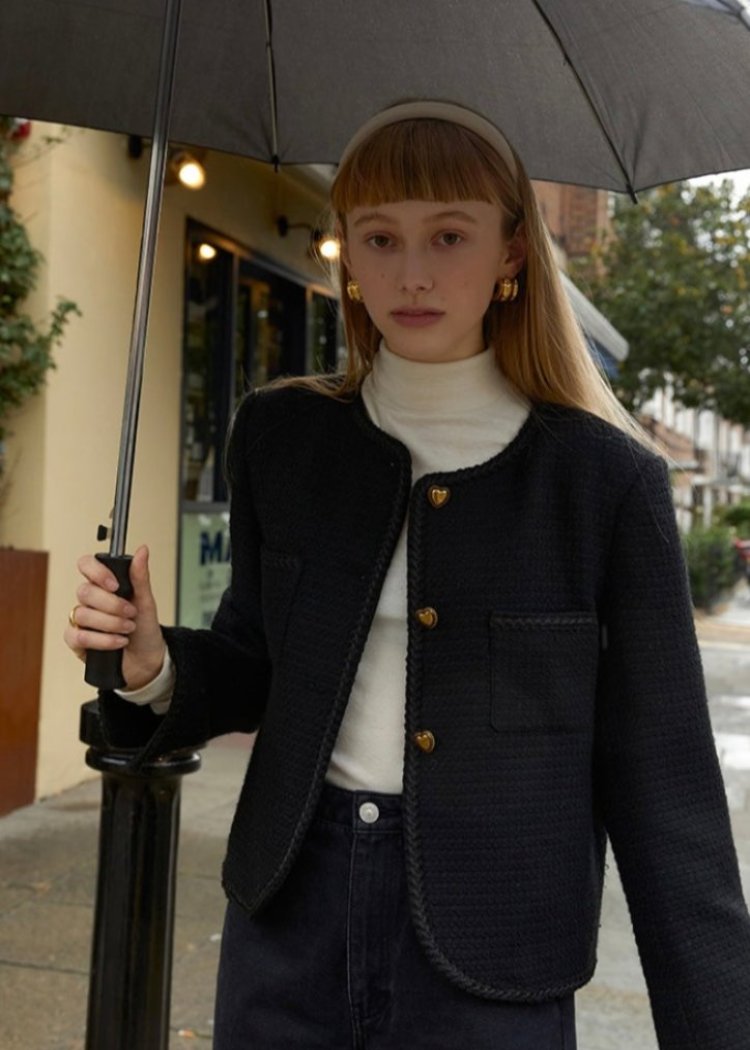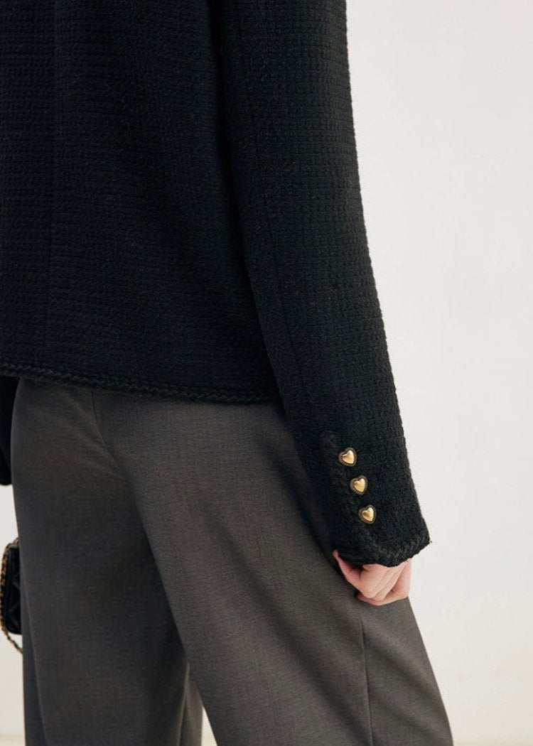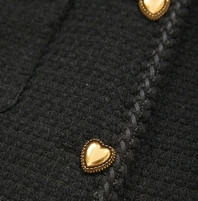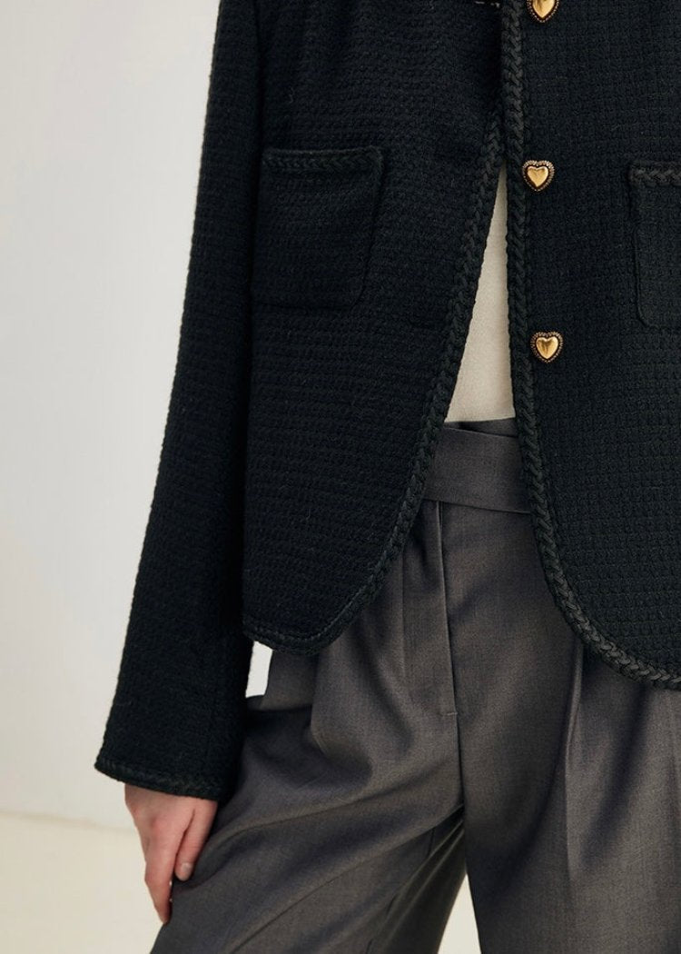 ゴールドのハートボタンがポイントのツイードジャケット。