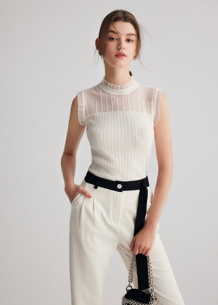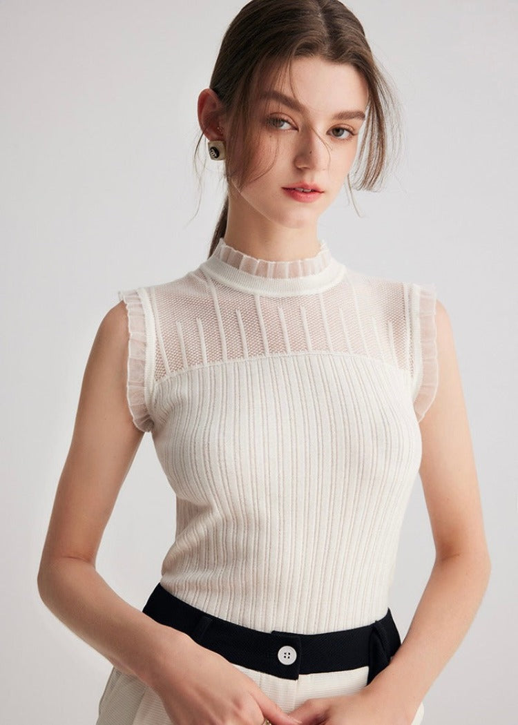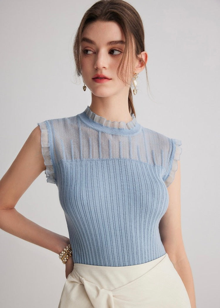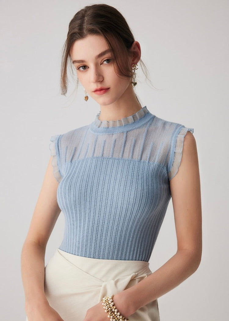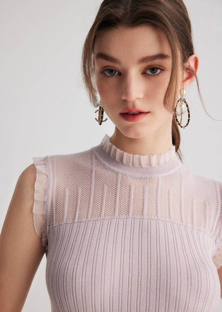 首元の華麗なフリルとシースルーデザインが印象的なスタイルアップニットトップ。