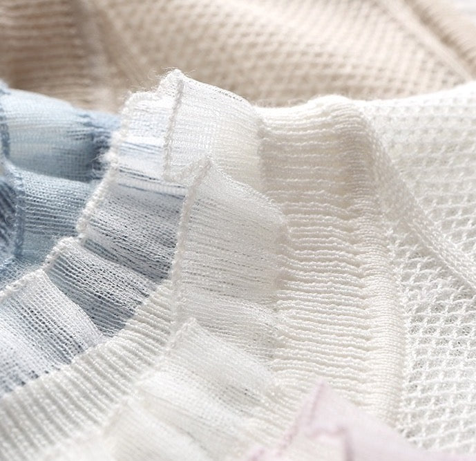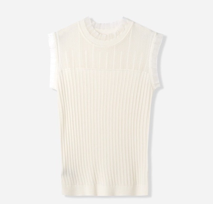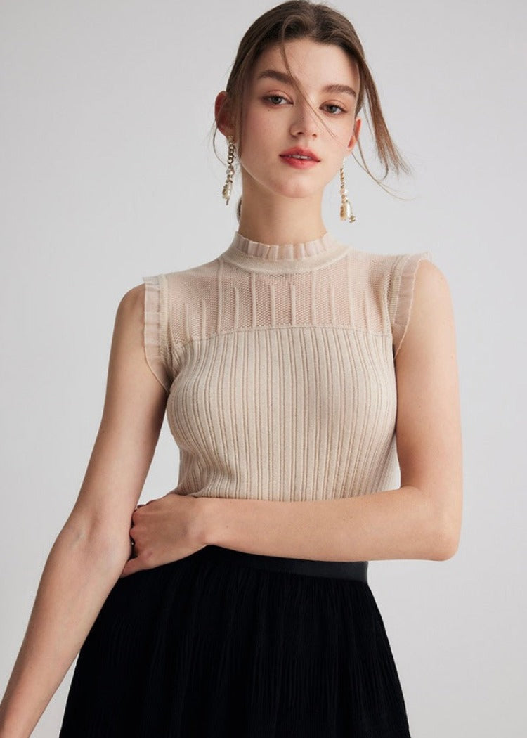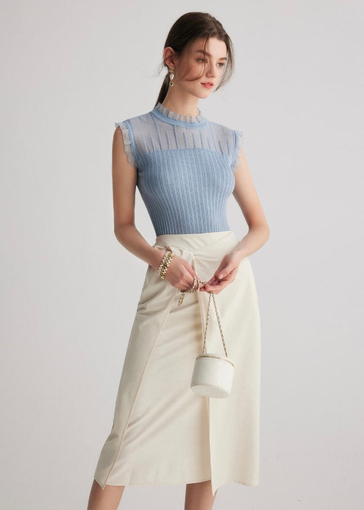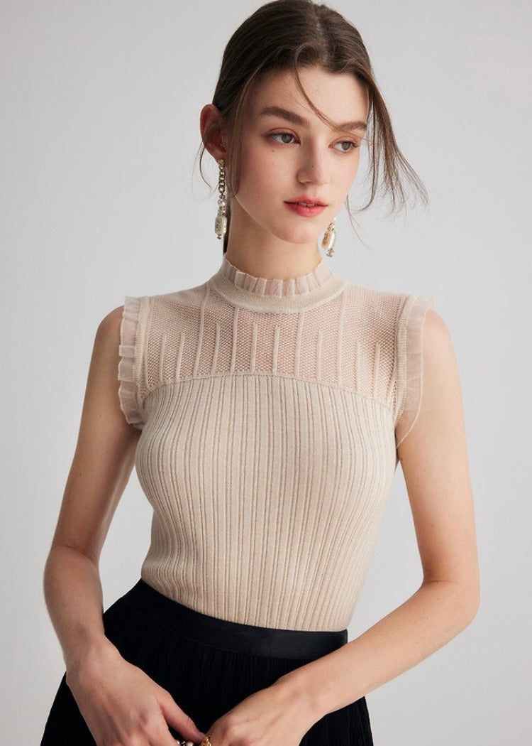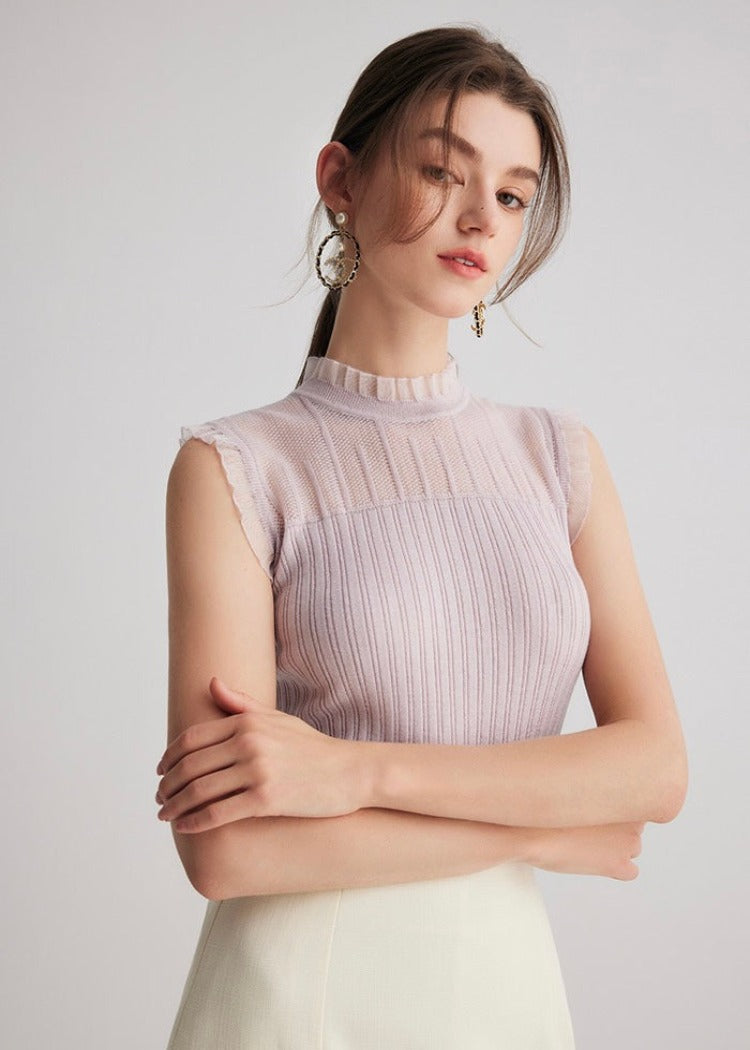 首元の華麗なフリルとシースルーデザインが印象的なスタイルアップニットトップ。