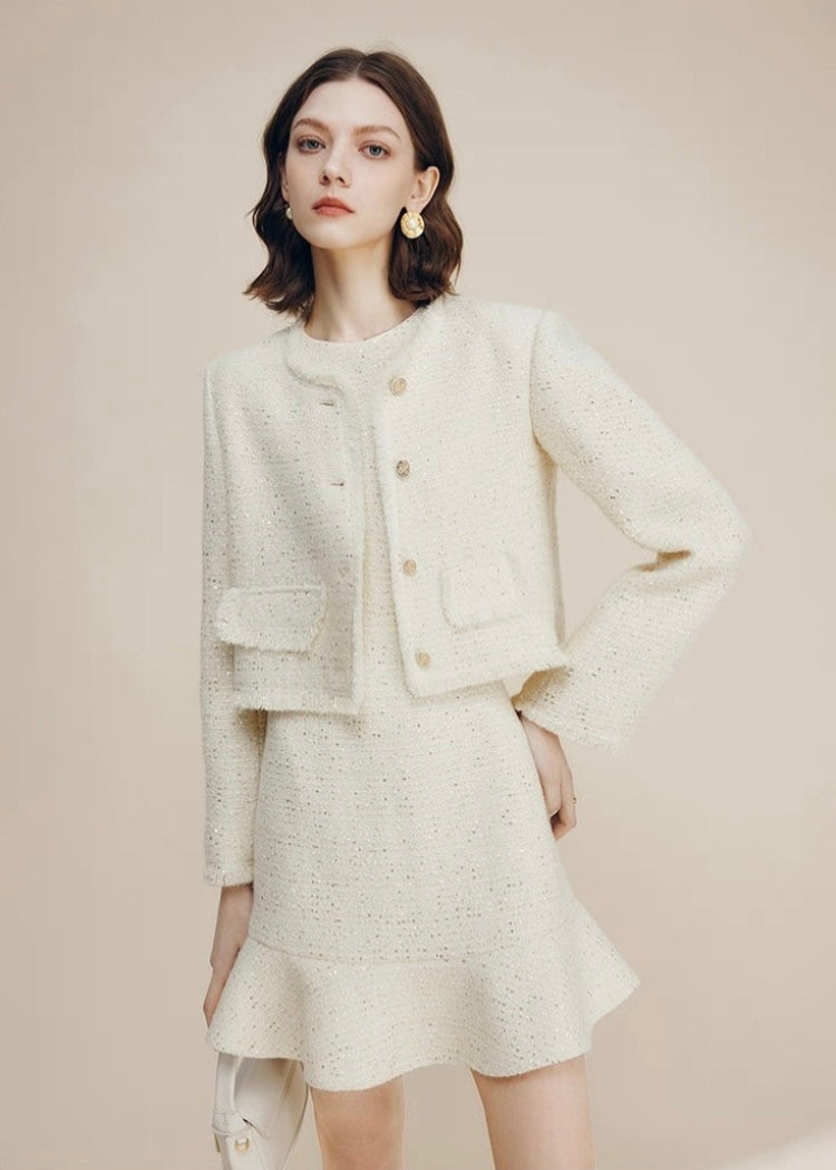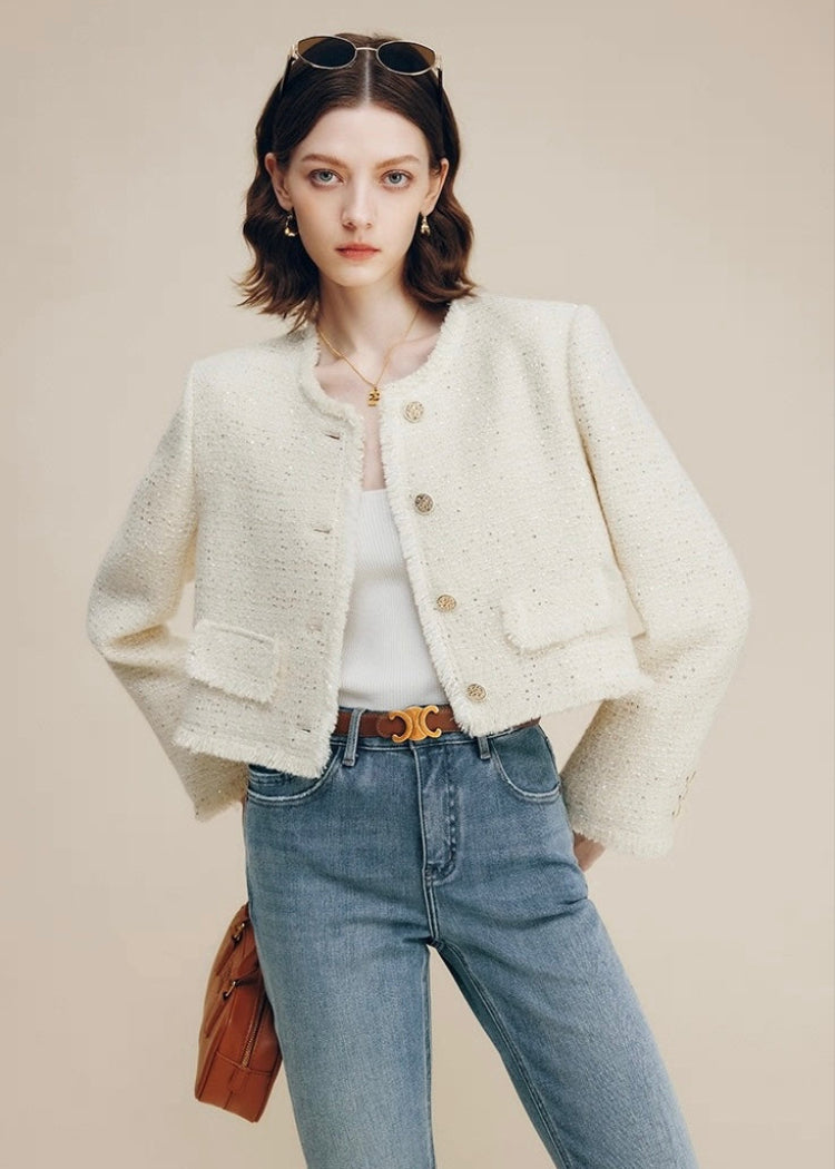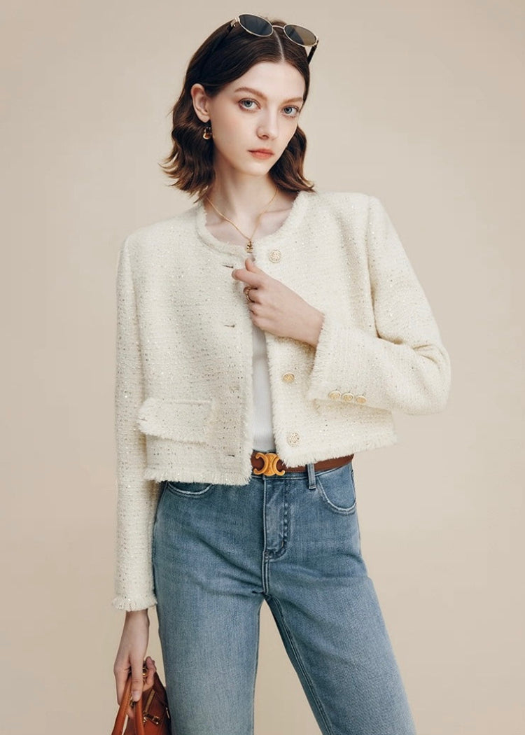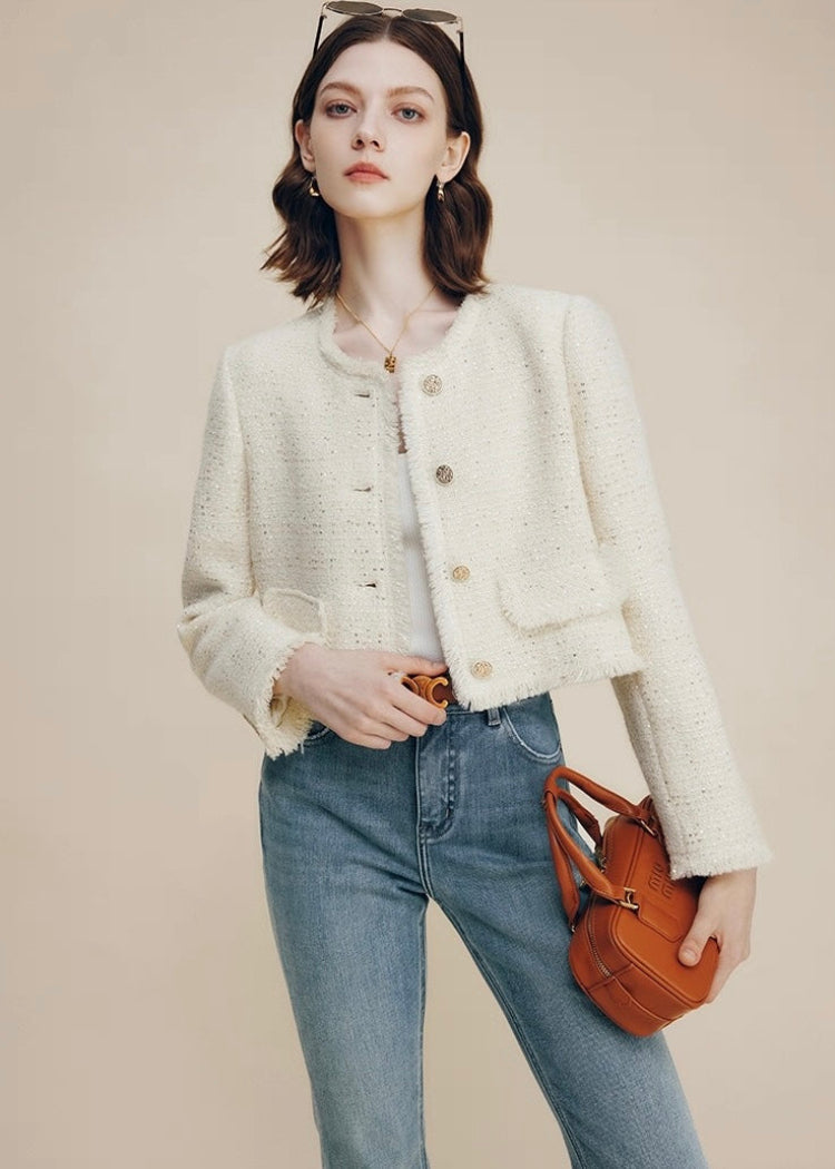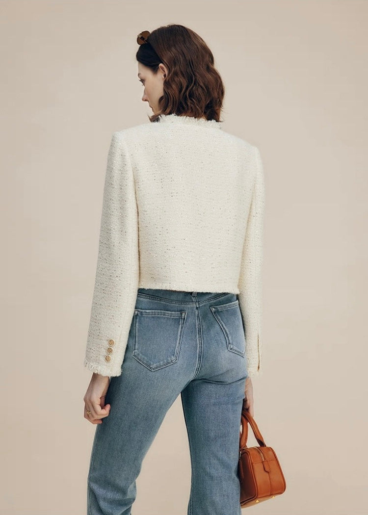 上質なツイードで仕立てたジャケットは、コンパクトで洗練されたシルエットが魅力。