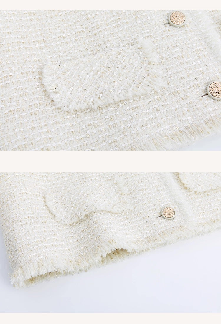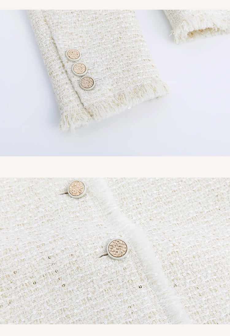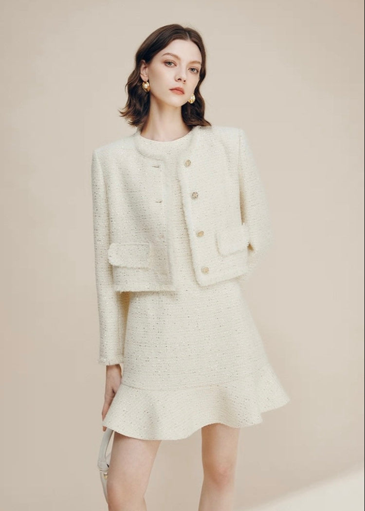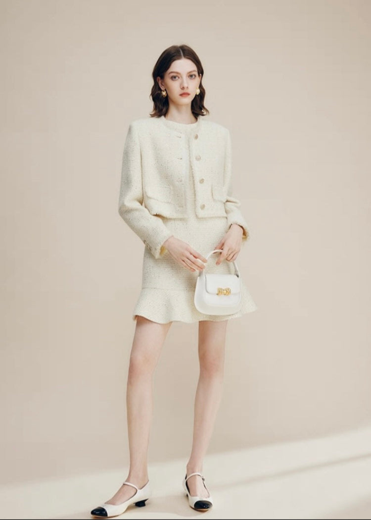 上質なツイードで仕立てたジャケットは、コンパクトで洗練されたシルエットが魅力。