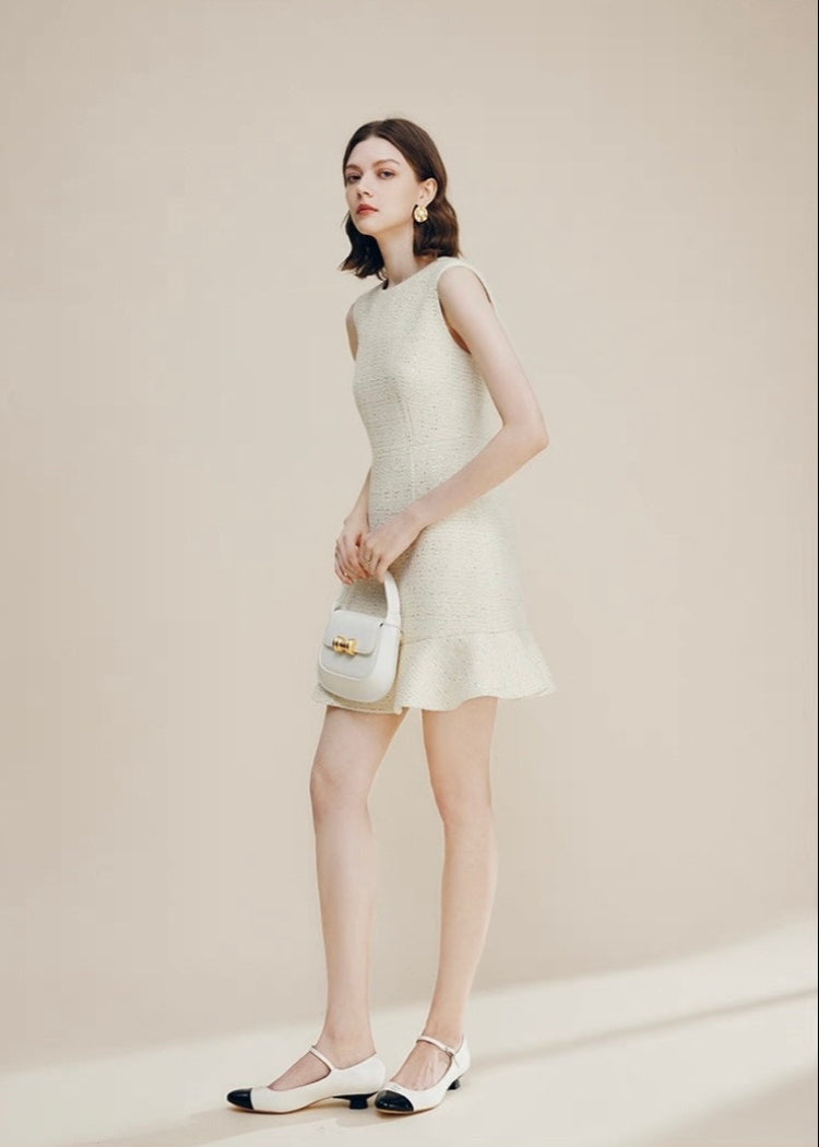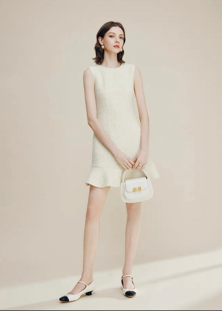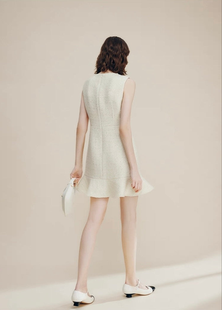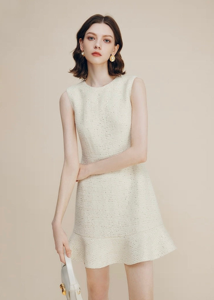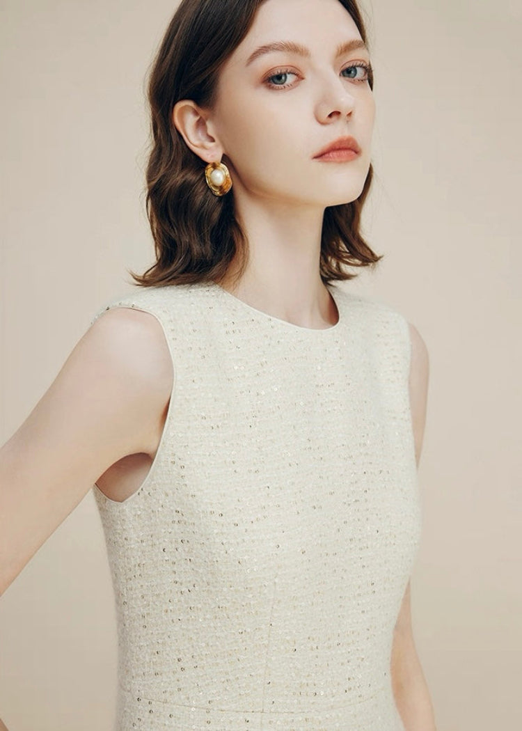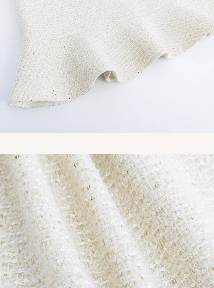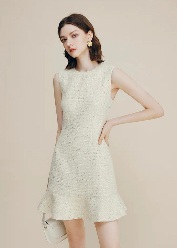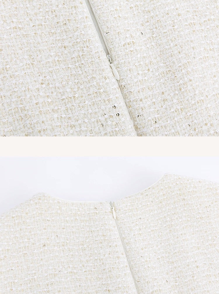 繊細なラメ糸を織り込んだ上質なツイード素材を使用し、柔らかなアイボリーカラーが上品な華やかさを引き立てるワンピースです。