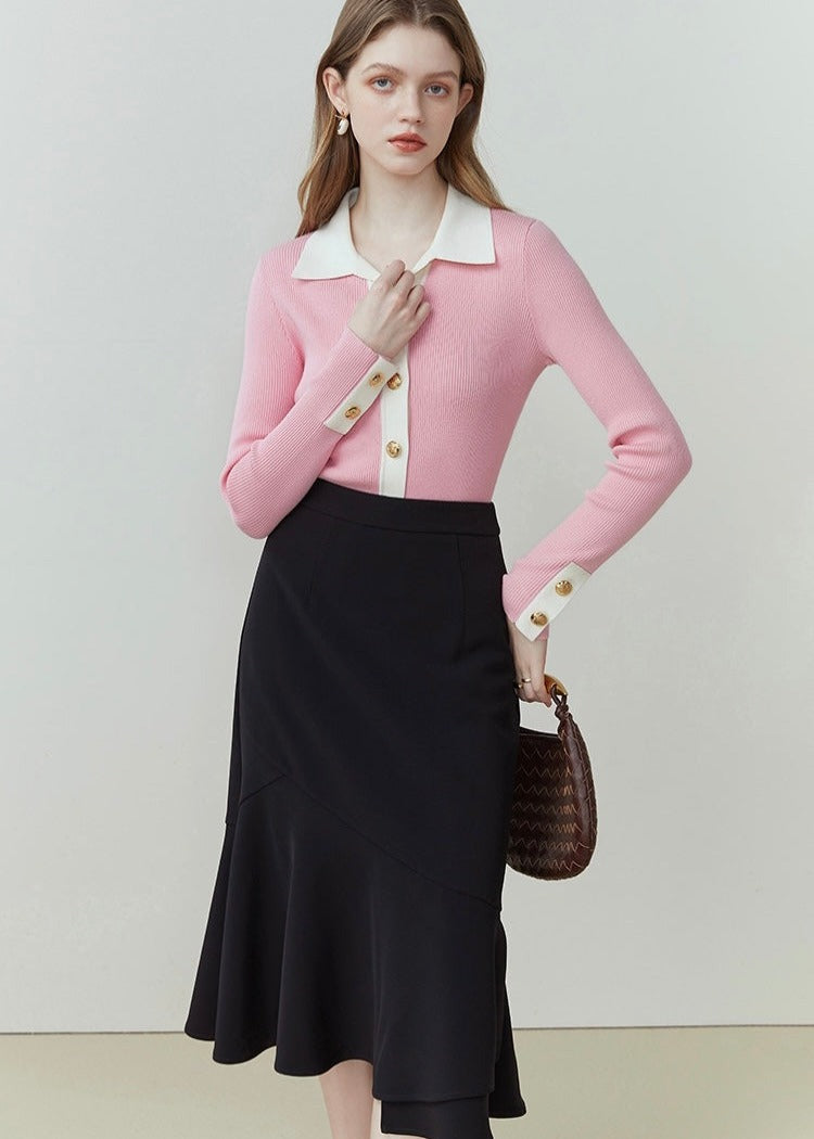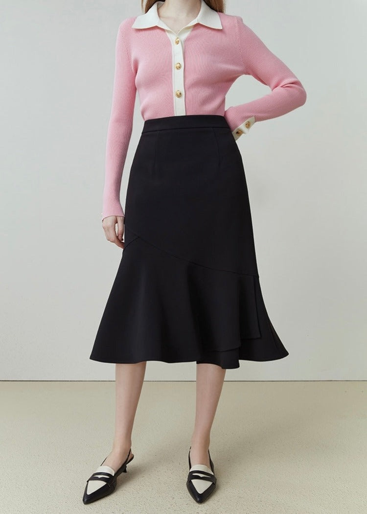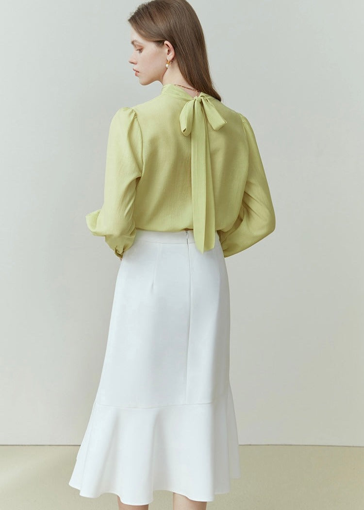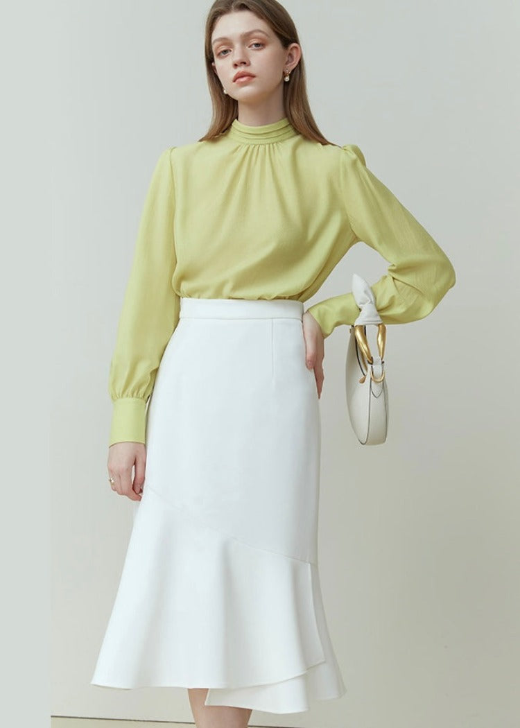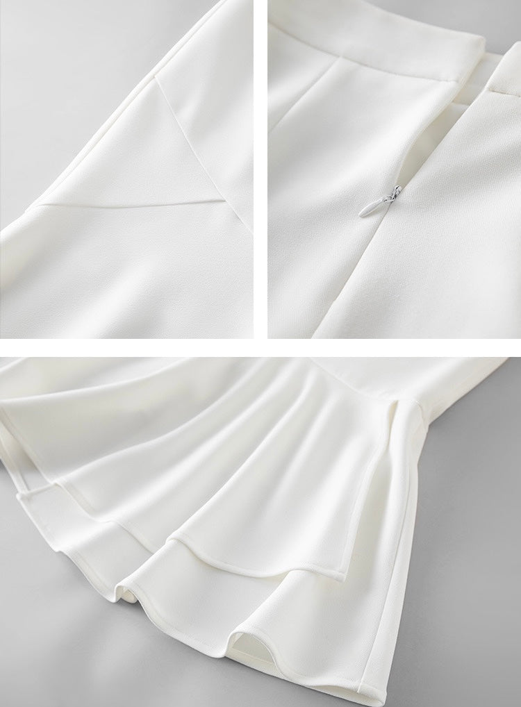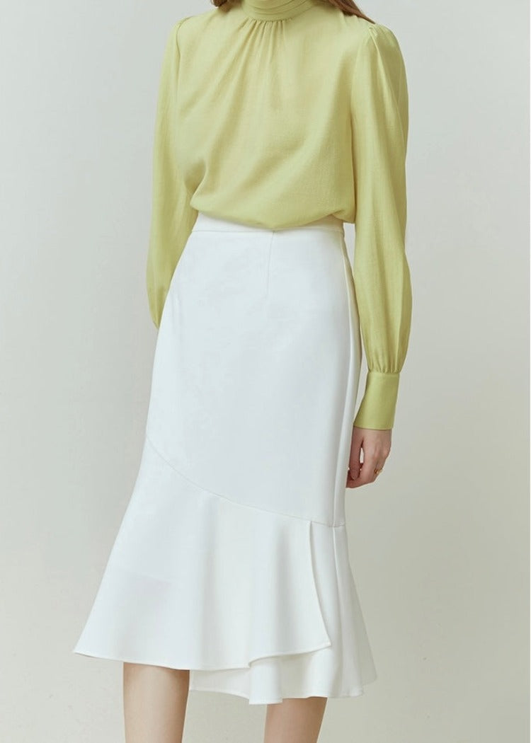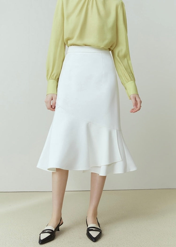 レースを斜めに施し、裾は程よいアシンメトリーフォルム、全体は緩やかなマーメイドシルエットとなっております。動くたびに柔らかに揺れ、フェミニンな印象を与えます。シワになりにくく滑らかな着心地です。