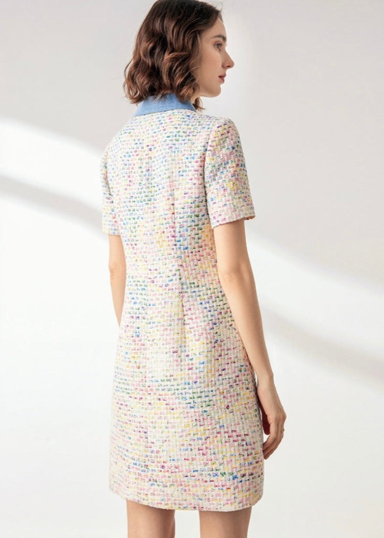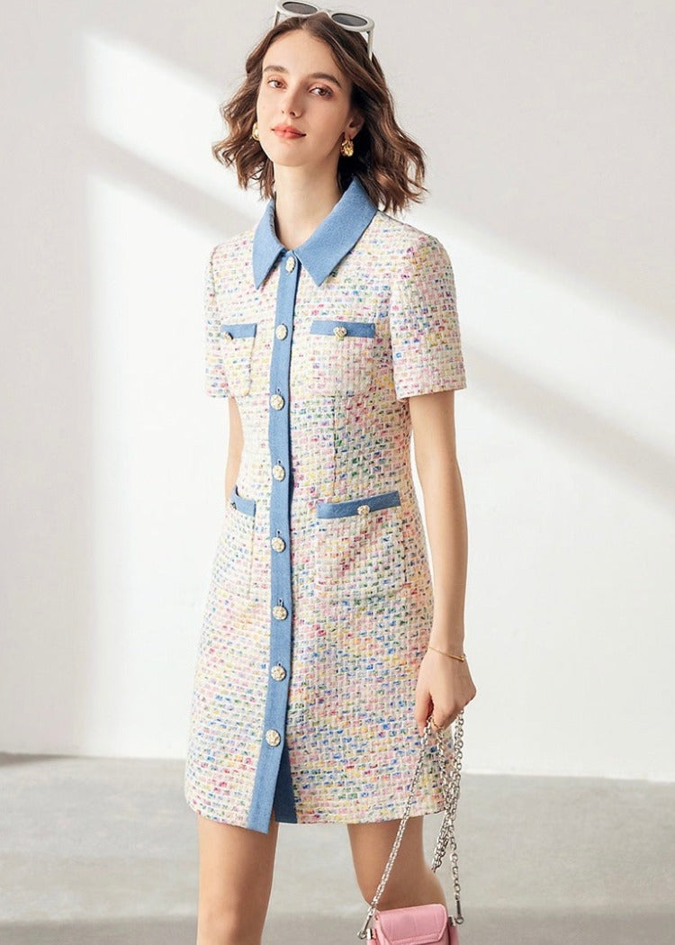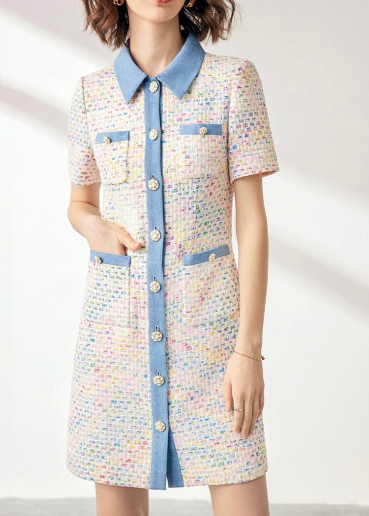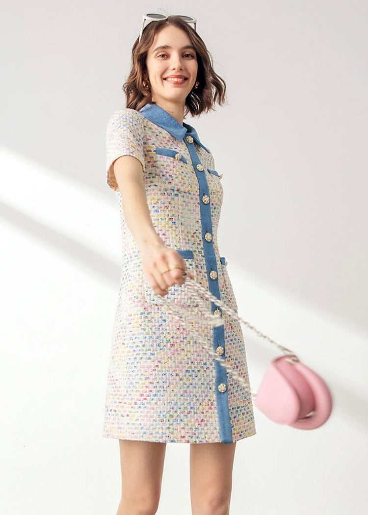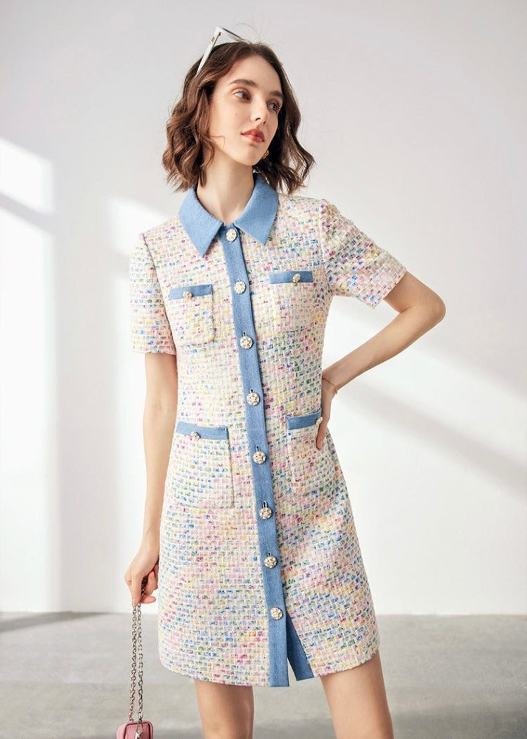 フラワーデザインボタンや、デニム地のアクセントなど細部にこだわり、かわいいがたくさん詰まったこちらのワンピースは春夏の上品カラーコーデとしておすすめしたい一着です。