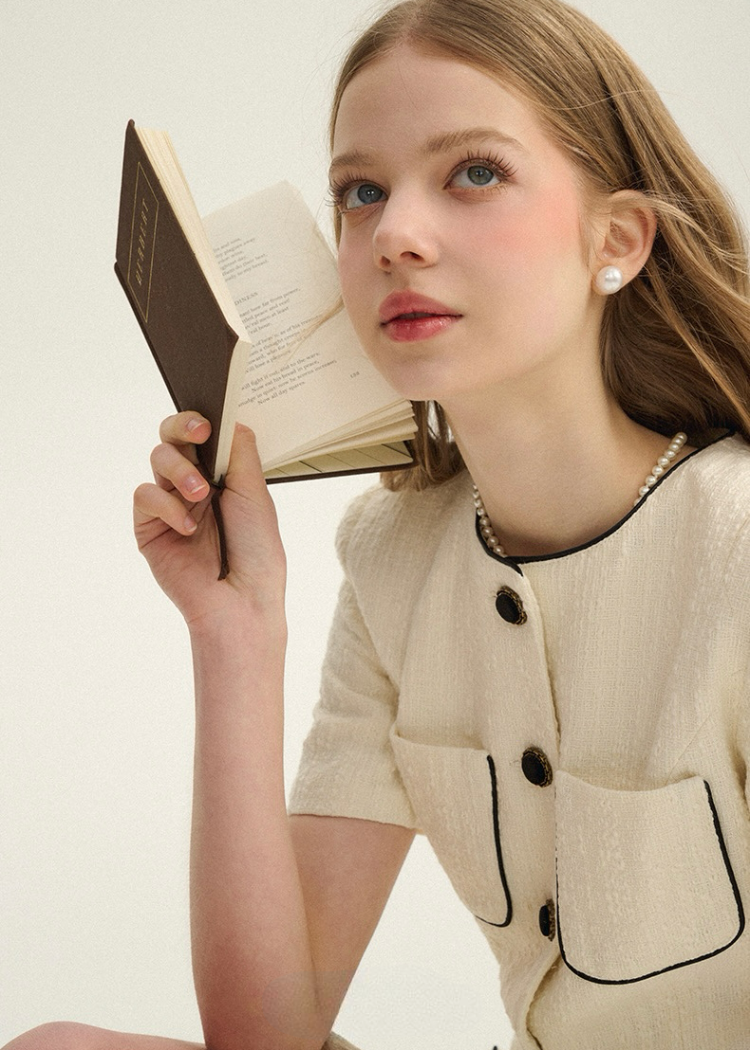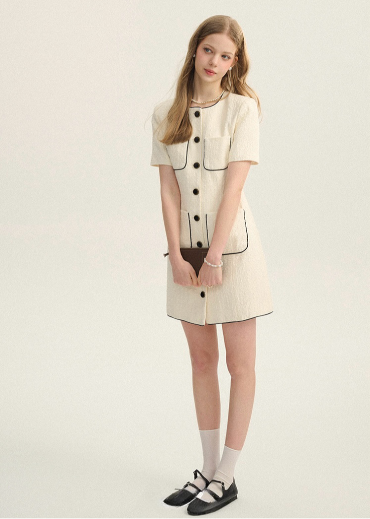 エレガントで洗練されたパリジェンヌ風のミニドレス。ツイード素材が上品さを演出し、ブラックのパイピングディテールがクラシカルで洗練された印象を与えます。ウエストを美しく引き締めるシルエットで、女性らしいエレガンスを引き立てるデザイン。フロントのボタンとポケットがアクセントになり、カジュアルにもフォーマルにも対応可能な一着です。オフィスやデート、特別なシーンにもぴったりな、大人のための上品なワンピース。