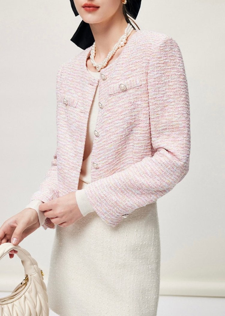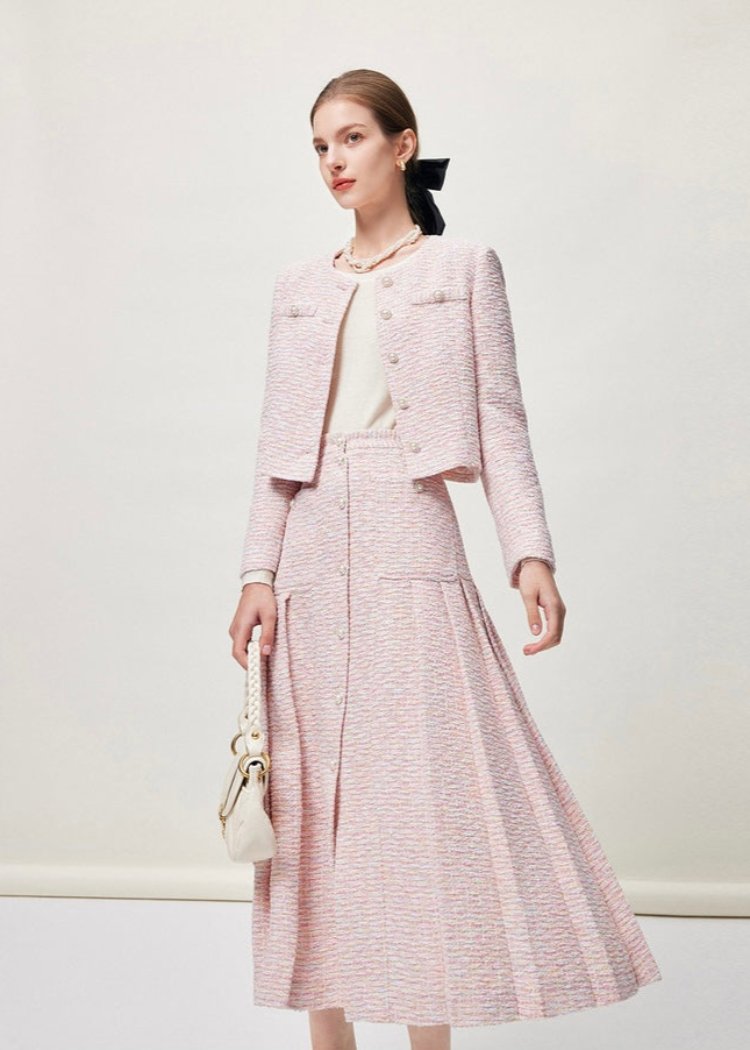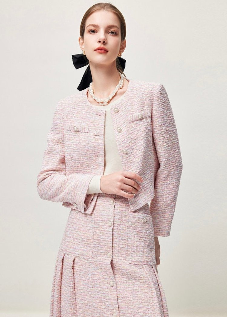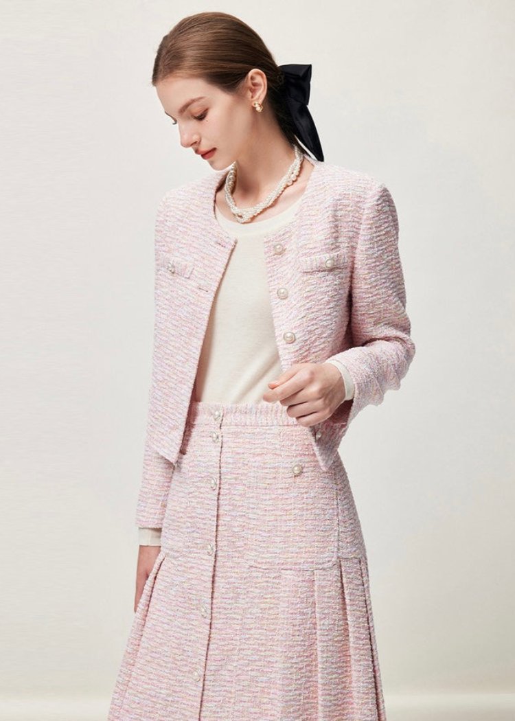 パールのボタンでエレガントさをさらに格上げ。明るめでお肌に馴染む柔かいピンクのお色味は大人の女性が着ても甘くなりすぎない印象です。