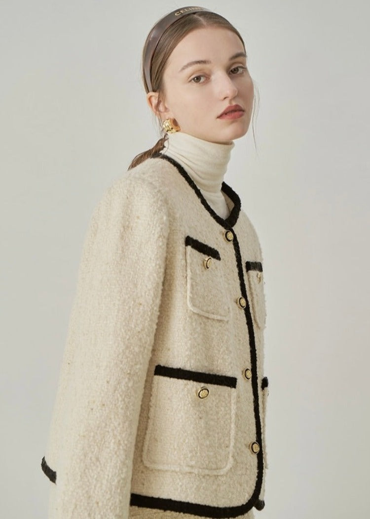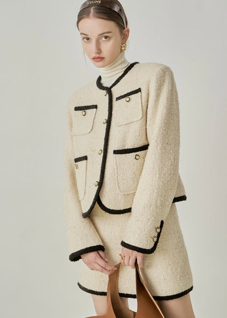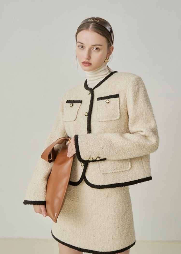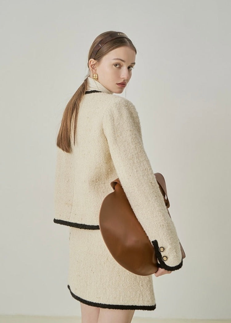 クリームホワイトベースに黒のパイピングを施し、柔らかい印象ながらもきちんと感を出しました。
