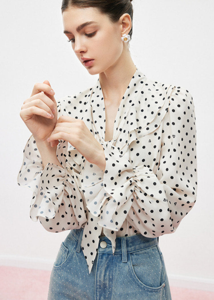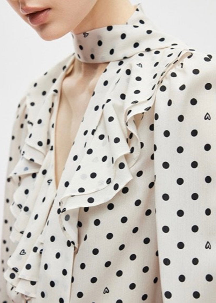 フレンチロマンティックスタイルを取り入れたエレガントなドットブラウスです。軽やかなシフォン素材が肌にふんわりと馴染み、春らしい着心地を叶えます。フェミニンなボウタイリボンとダブルフリル襟が顔まわりを華やかに演出し、甘すぎない大人の可愛さをプラス。デニムにもタイトスカートにも合わせやすく、オン・オフ問わず活躍する一枚です。