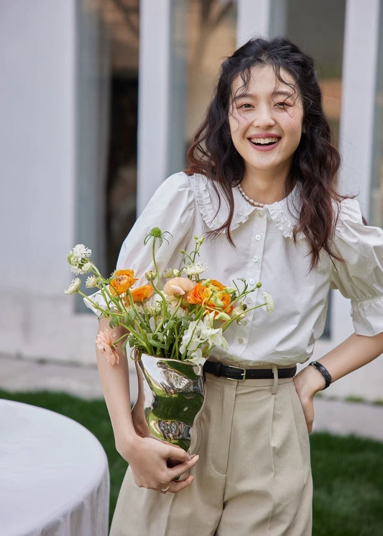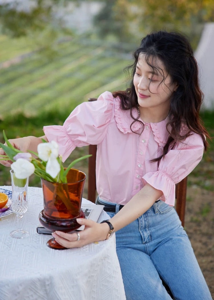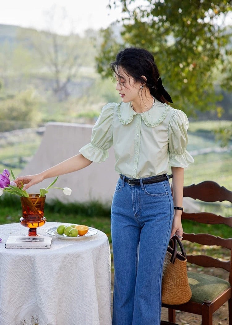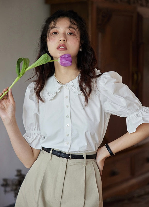 A ruffle puff blouse with soft sleeves for a feminine impression.