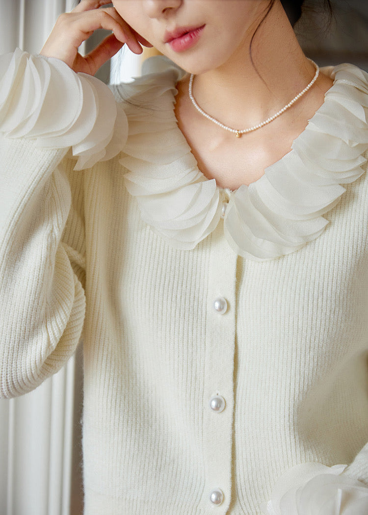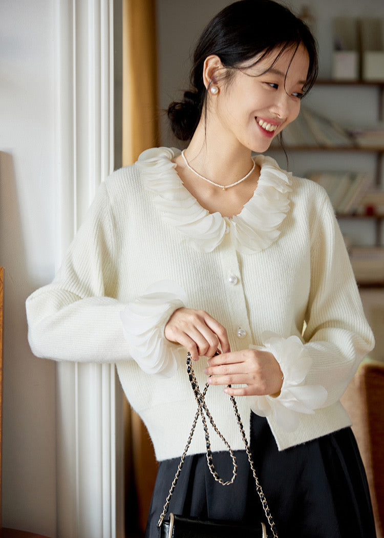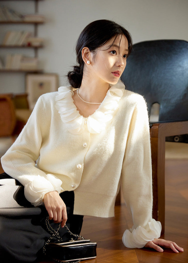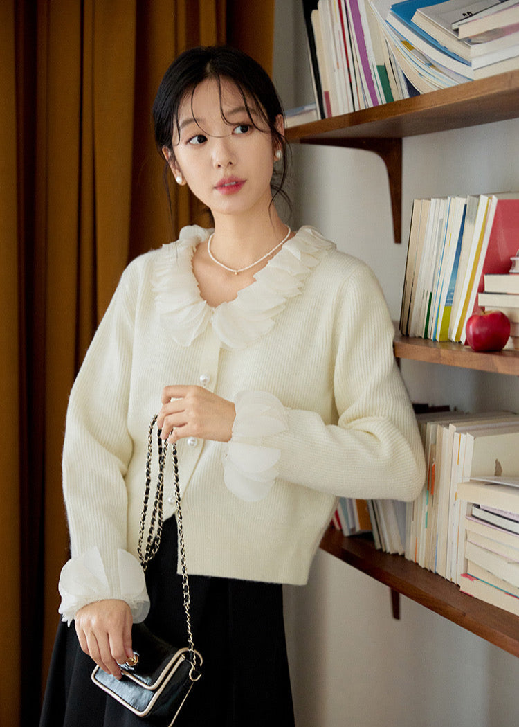 エレガントなフリル襟と袖口が魅力のニットカーディガン。