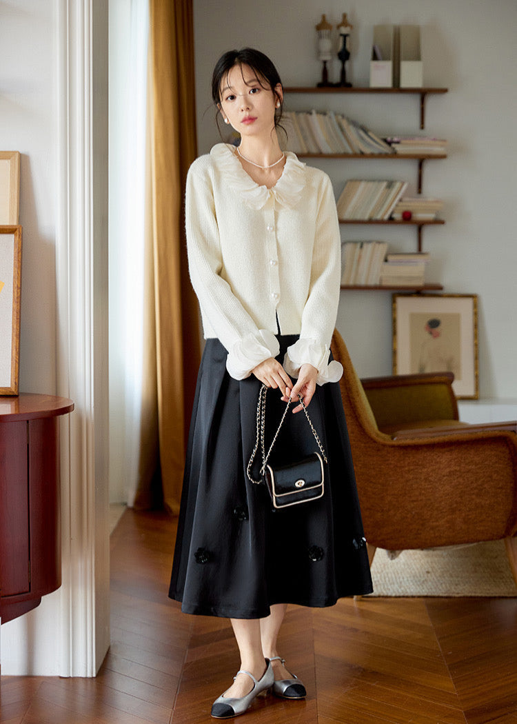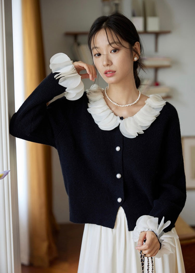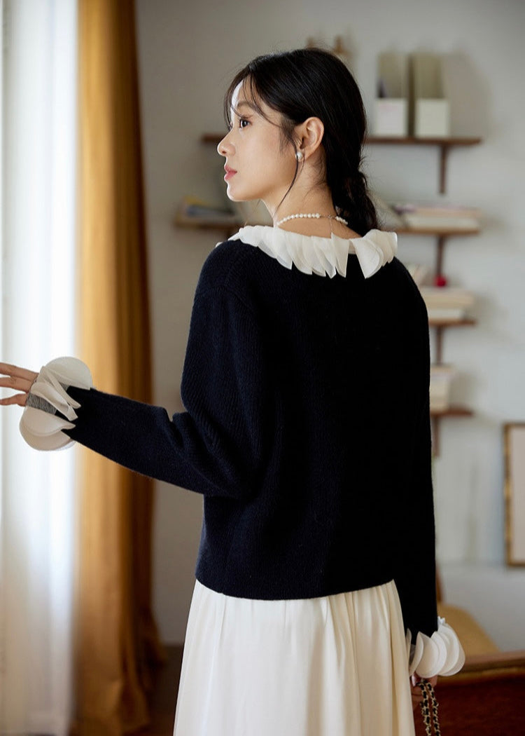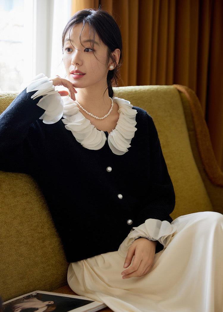 エレガントなフリル襟と袖口が魅力のニットカーディガン。