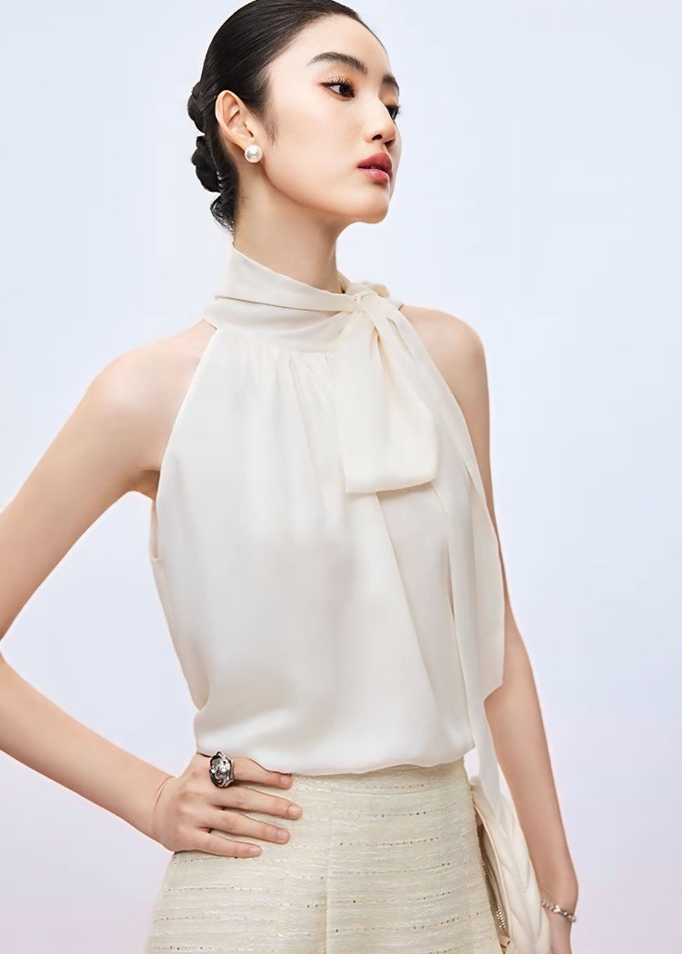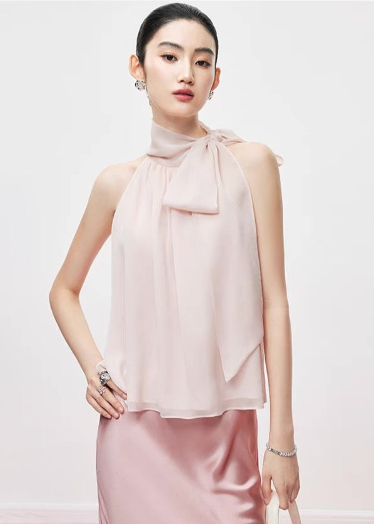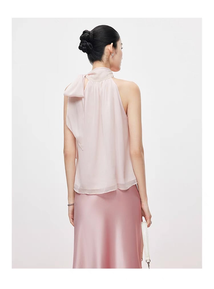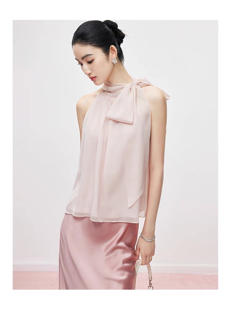 動くたびにふんわりと揺れる、シアーシフォン素材のボウタイブラウス。
