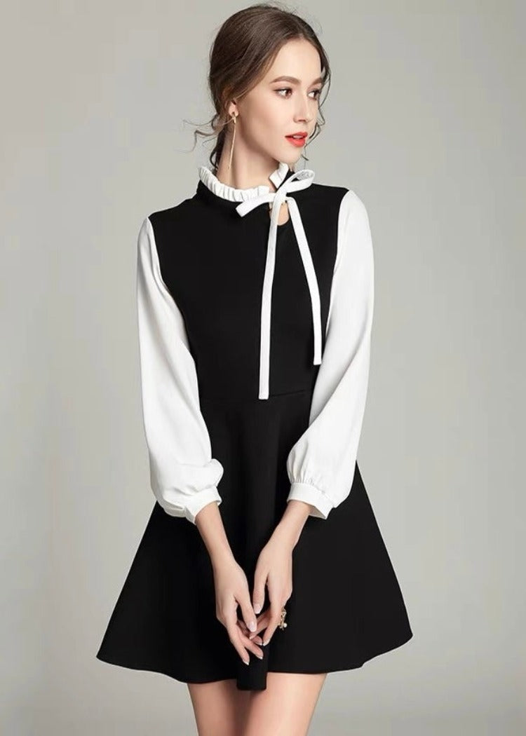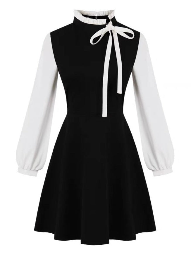 A dress with an elegant yet cute impression that features a ribbon at the neck and puff sleeves.