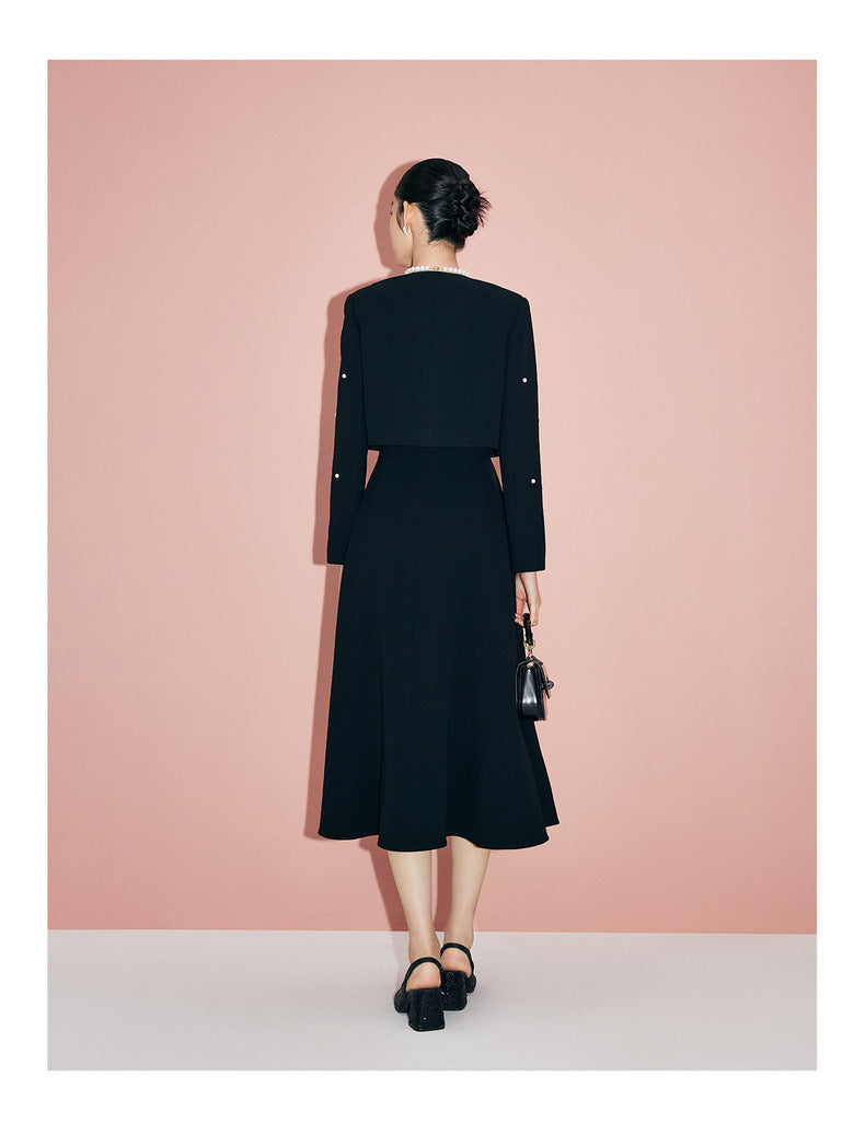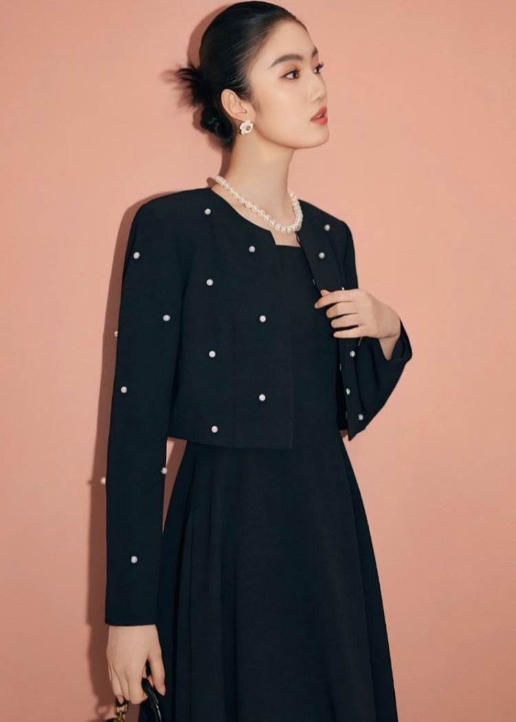 パールの装飾が華やかで、柔らかく着心地の良い生地を使用したジャケット。