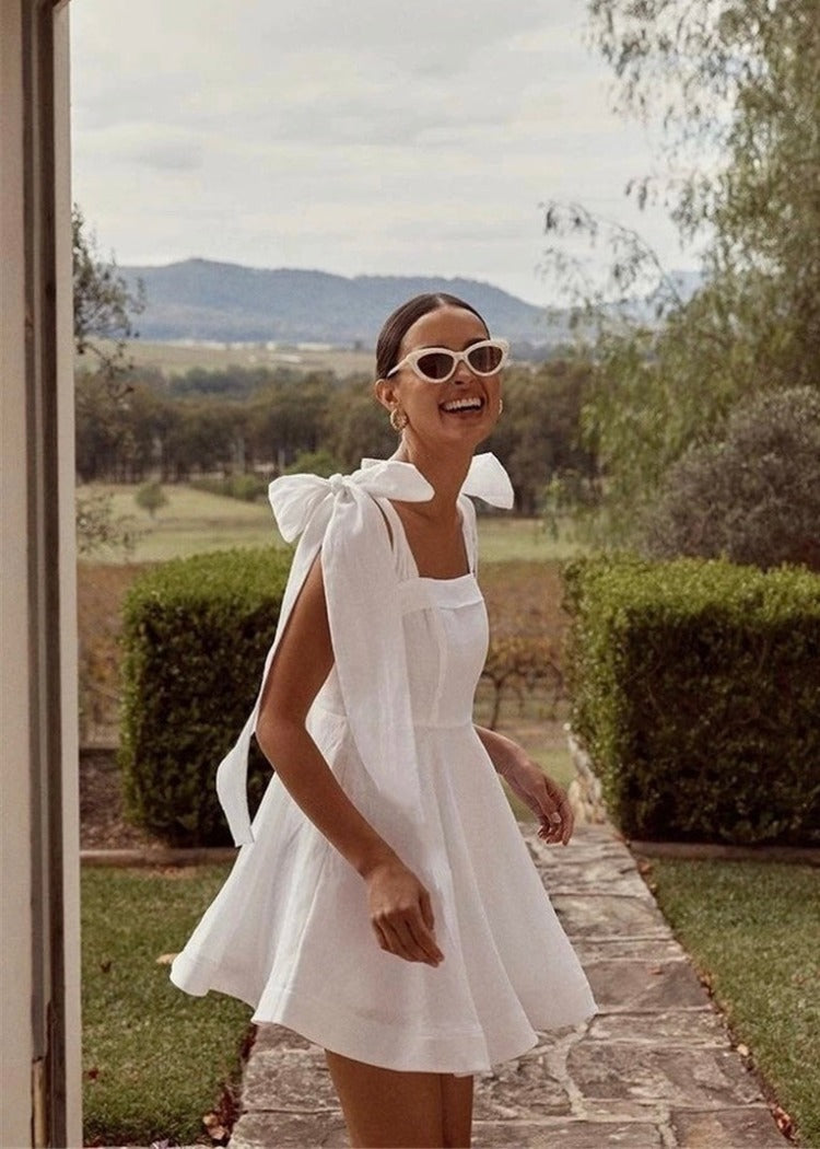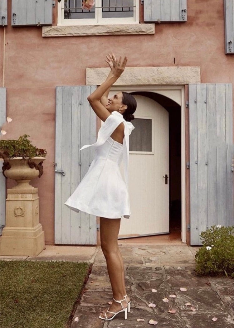 A flared mini dress featuring a large ribbon on the shoulder.