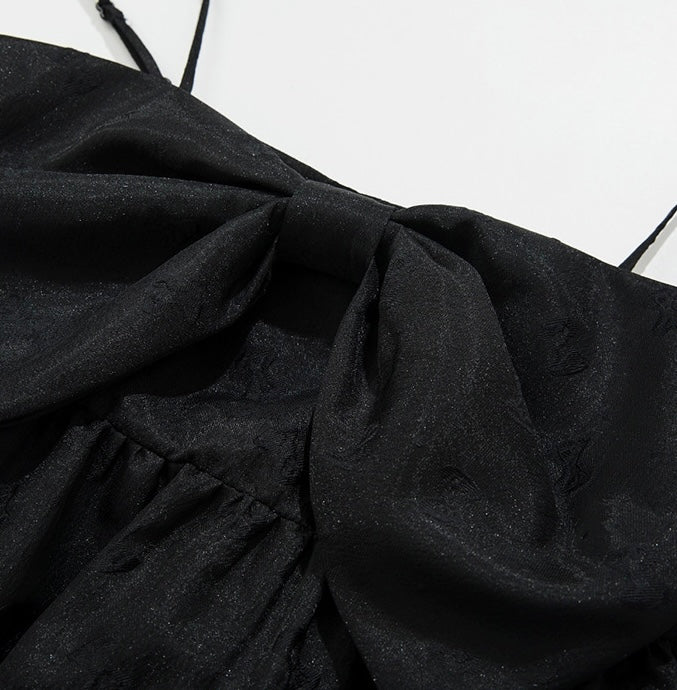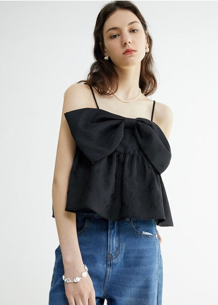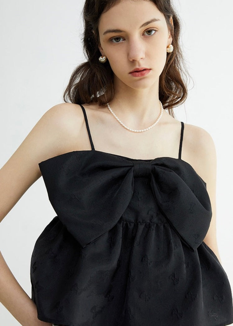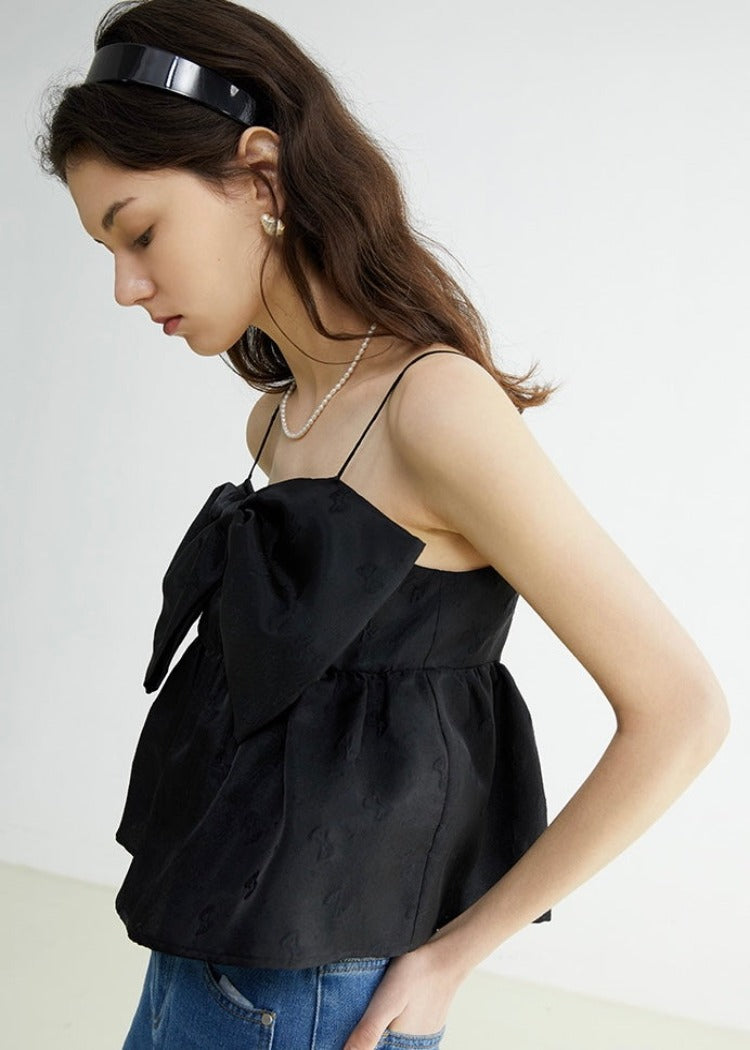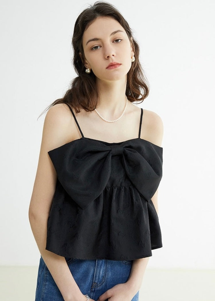 1枚でレディな装いになる、大きめに膨らんだ立体的なボリュームリボンが印象的なキャミトップス。ジャガード織りの立体感のある生地で存在感のあるアイテムです。肩紐調整可能。