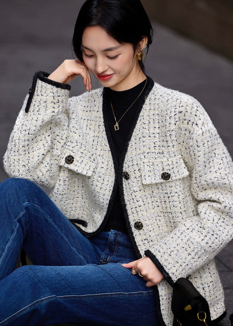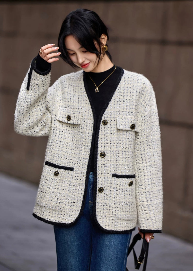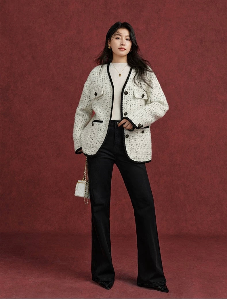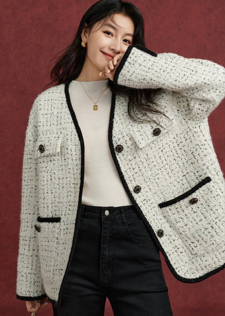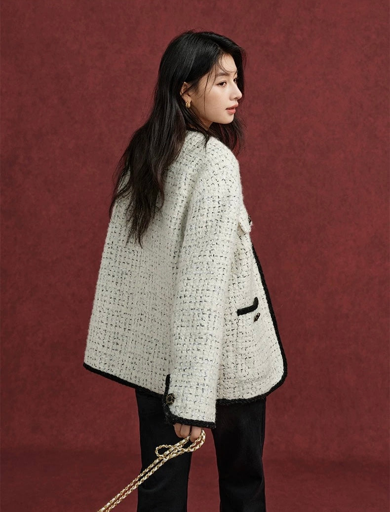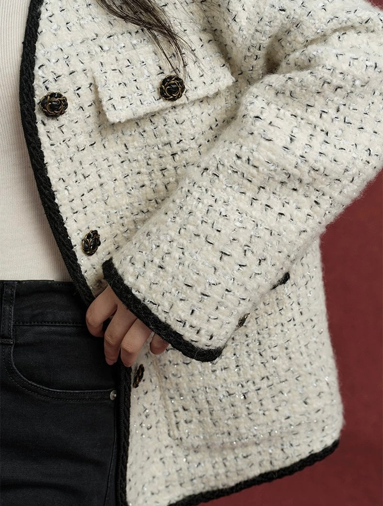 クラシカルな雰囲気を纏う上質なツイードジャケット。ミルキーホワイトの柔らかな色合いに、ブラックのトリミングとボタンを効かせたデザインが、洗練された印象を与えてくれます。上質な羊毛素材を使用したツイードは、暖かさもありながらも高級感があり、秋冬の装いを一段と華やかに仕上げてくれます。
