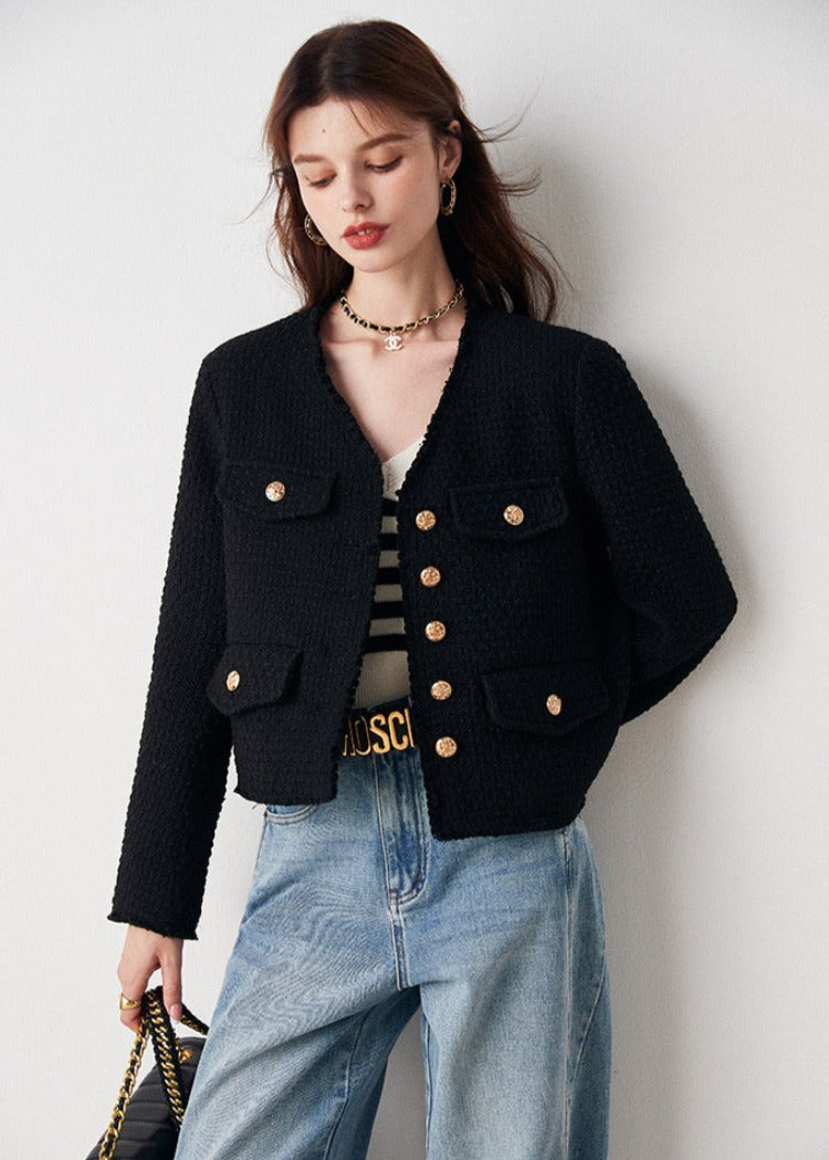 The V-neck makes it look neat, and even though it's black, it doesn't look heavy.