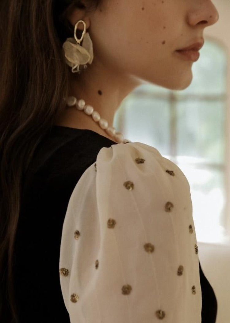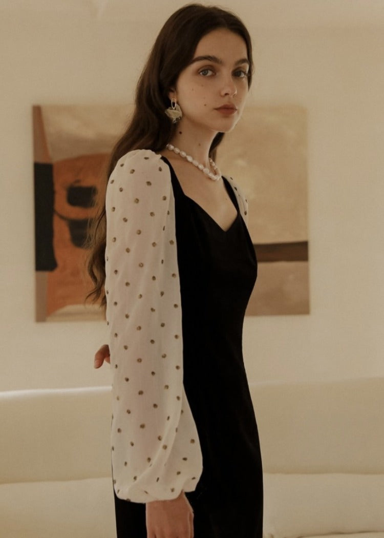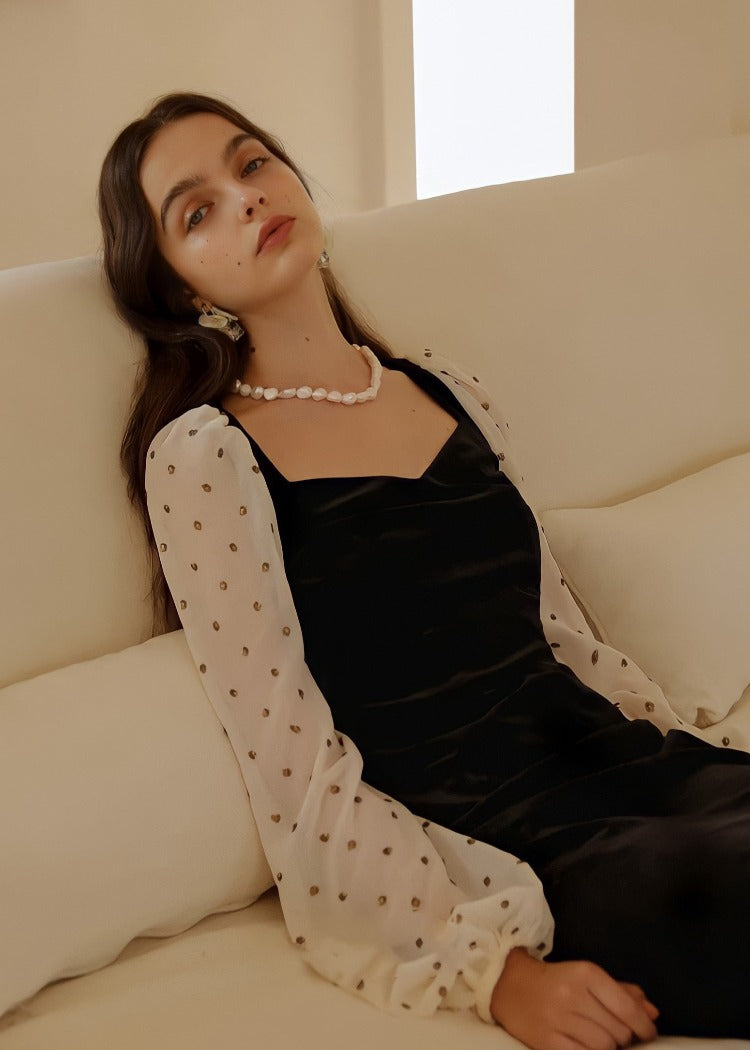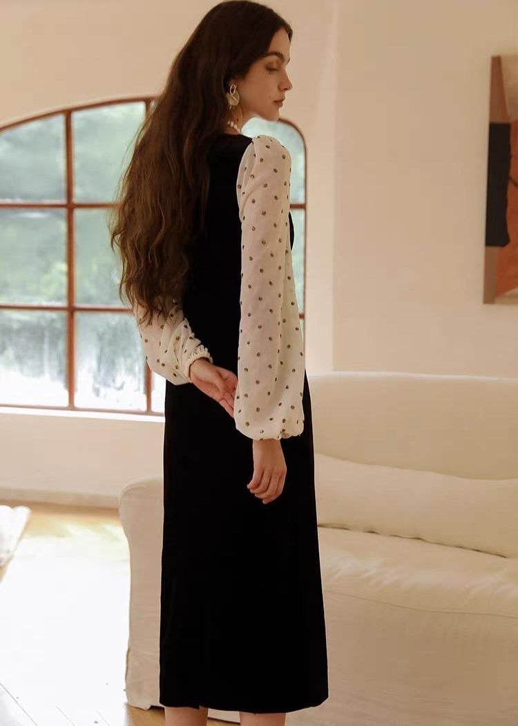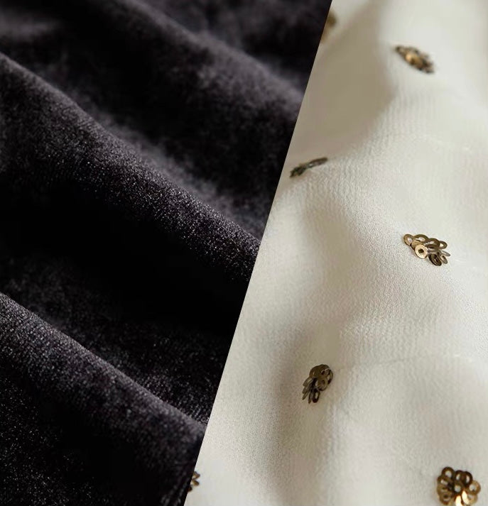 A dress with a seasonal mood with a mix of velvet and chiffon materials.
