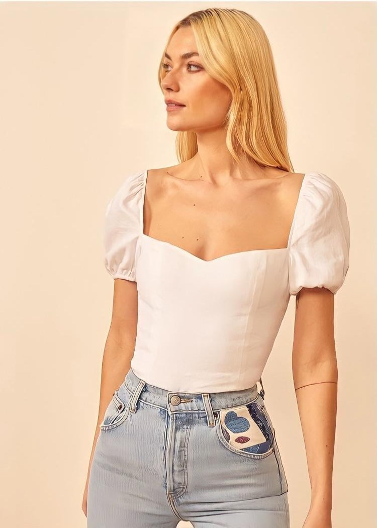 Linen top with puff sleeves. The ribbon on the back is also a point.