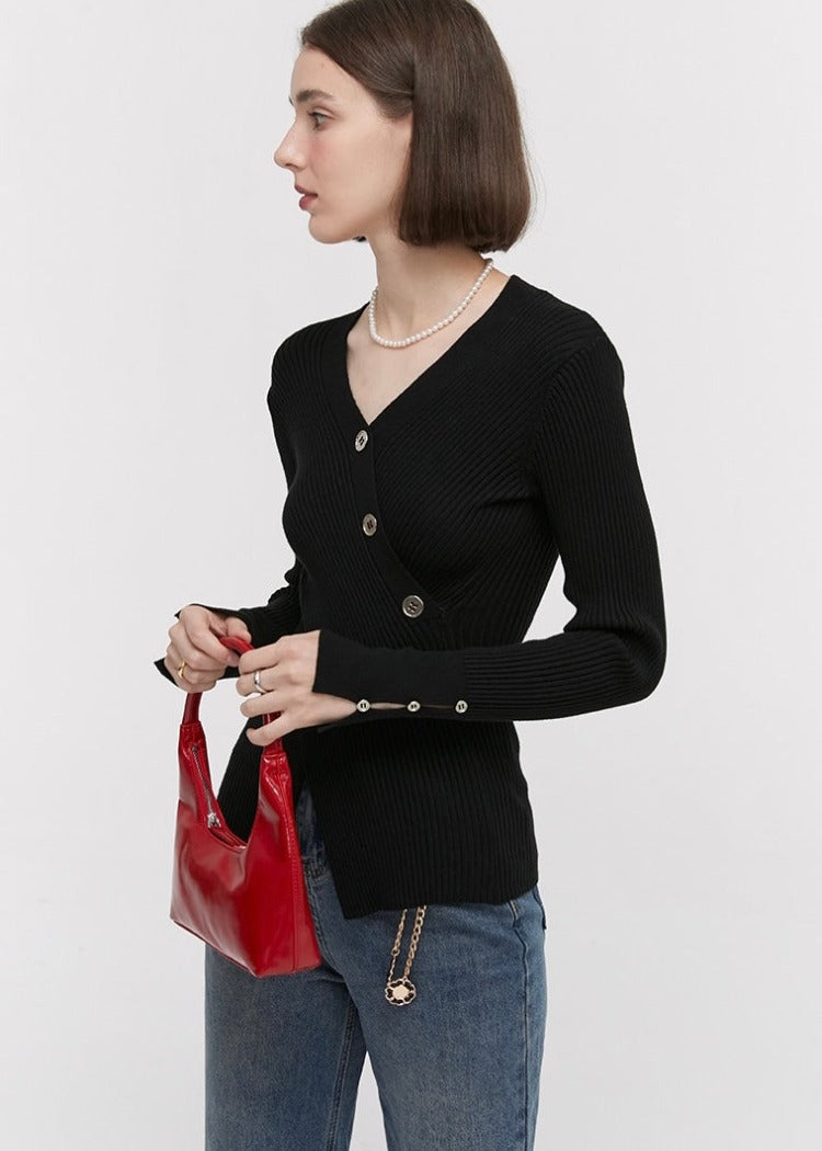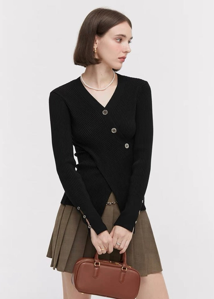 着るだけでスリムに見える斜めボタンラップデザインリブニット。