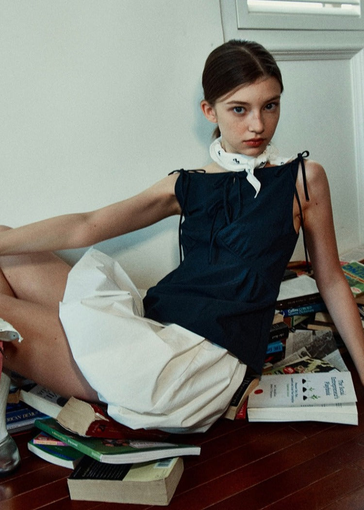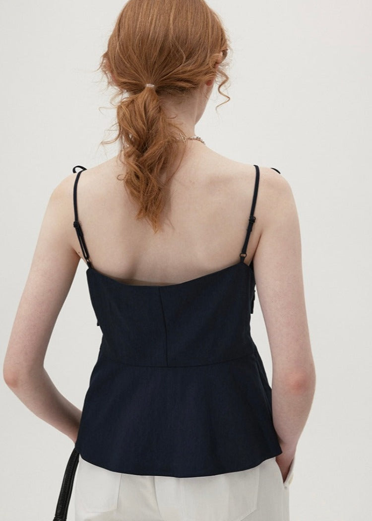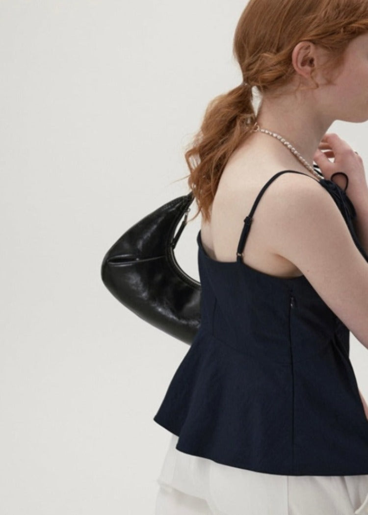 鎖骨下でのカッティングで顔まわりをすっきりと見せ、ウエストからさりげなく広がるペプラムシルエットでメリハリを出しました。